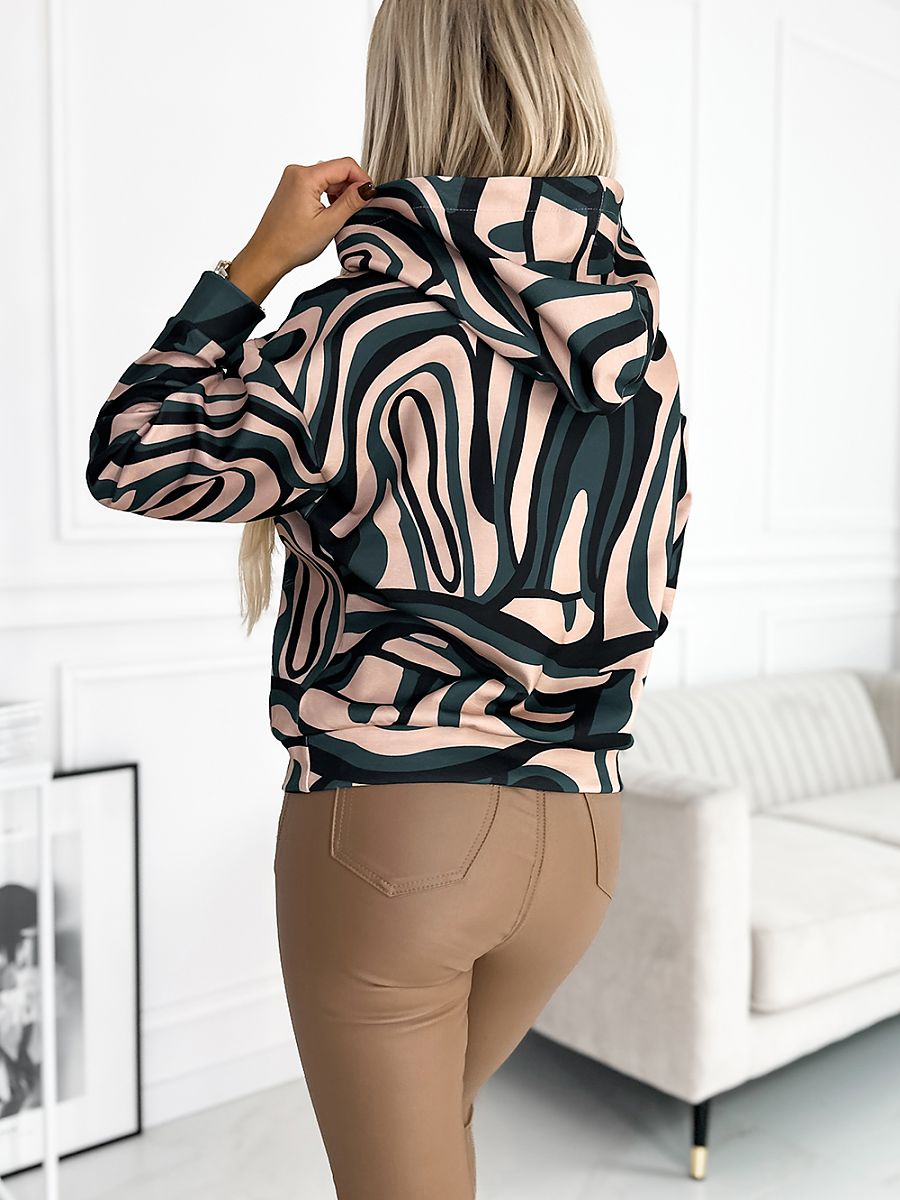 Wygodna bluza kangurka z kapturem oraz długim rękawem. Bluza w beżowo-zielone fale. Uszyta z ciepłego i lekko elastycznego materiału. Produkt polski. Marka numoco.