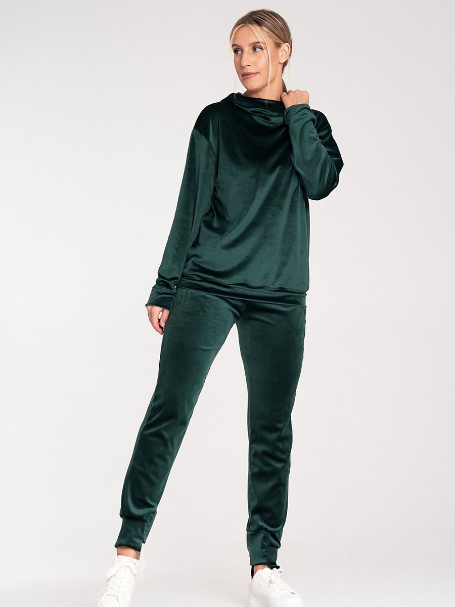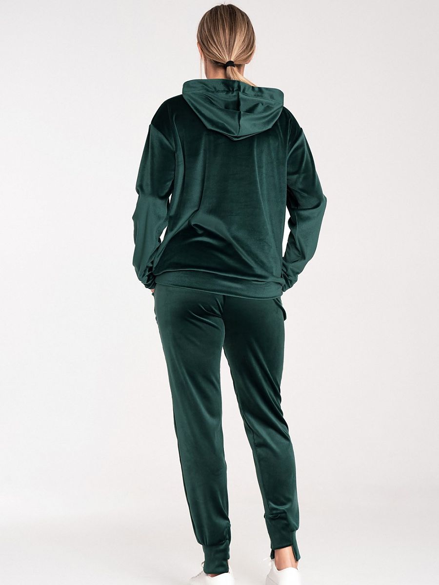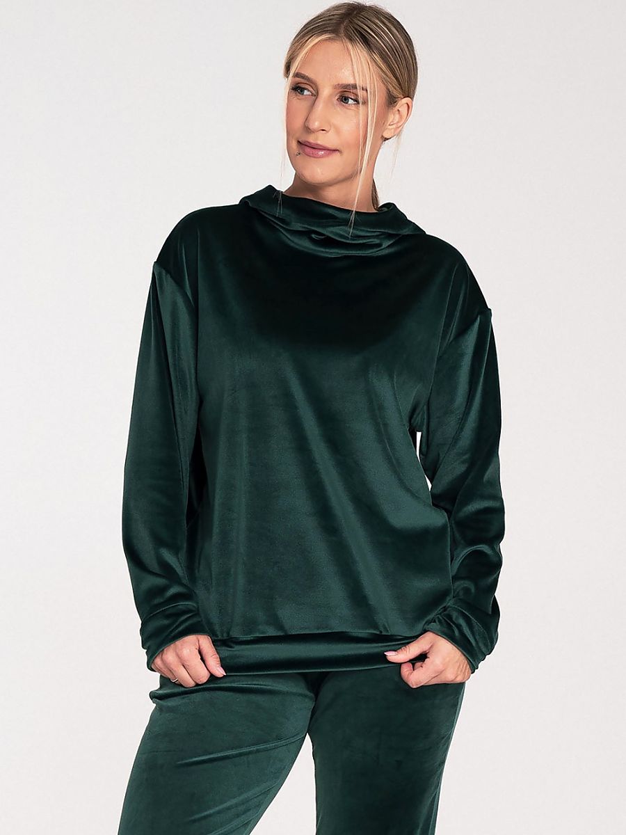 Zielona welurowa bluza z kapturem z luźną stójką. Długi rękaw i dół bluzy wykończony ściągaczem.
