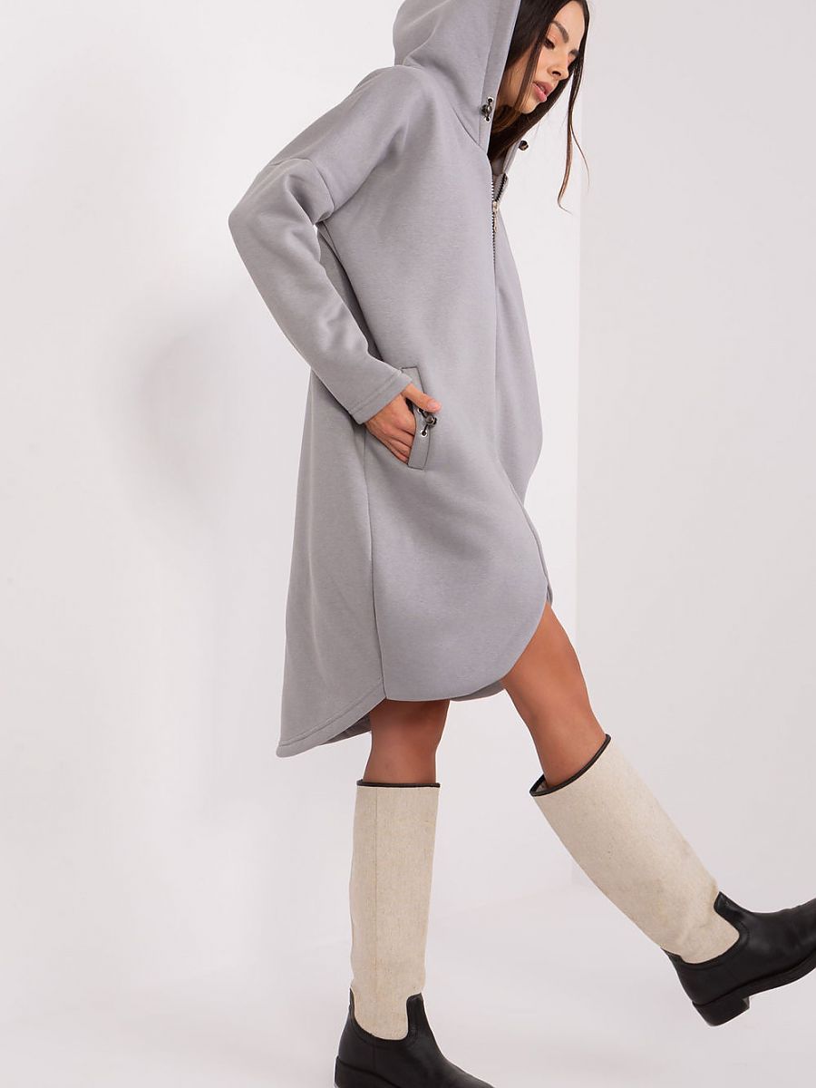 Bluza o przedłużanym kroju, zapinana na zamek. Bluza z długim rękawem oraz kapturem. Po bokach kieszenie wsuwane.