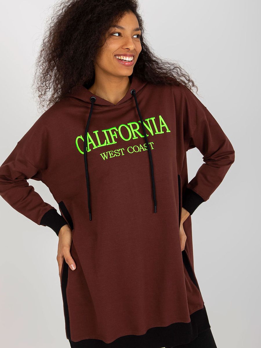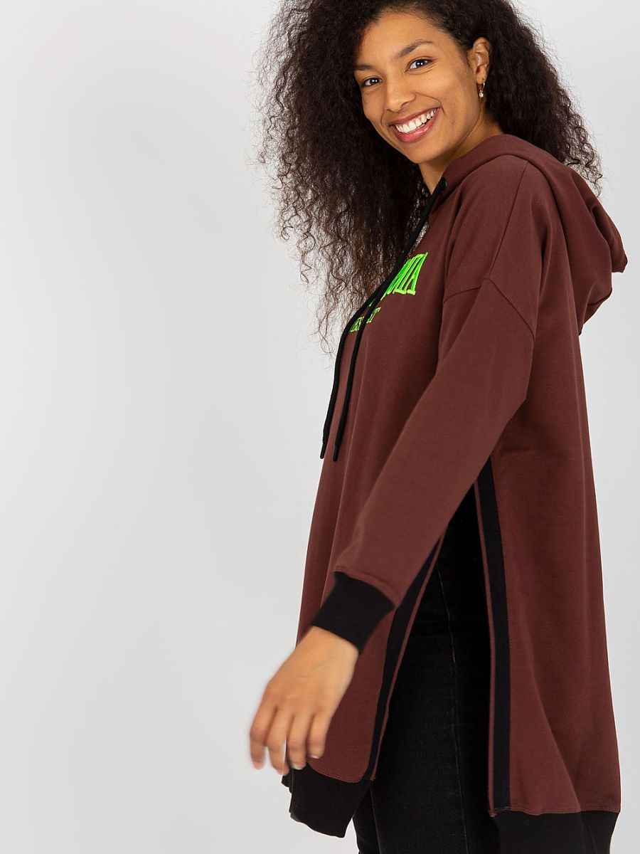 Długa damska bluza w stylu casual to idealny wybór dla kobiet ceniących komfort i prosty, nowoczesny design. Model charakteryzuje się gładkim wzorem, który nadaje uniwersalności, dzięki czemu bluza pasuje do wielu stylizacji. Wykonana z wysokiej jakości mieszanki bawełny, poliestru i elastanu, zapewnia wygodę noszenia oraz trwałość materiału. Przedłużony krój z rozcięciami po bokach dodaje lekkości i modnego wyglądu. Bluza wyposażona jest w praktyczny kaptur z troczkami, pozwalającymi na indywidualne dopasowanie. Na przodzie znajduje się stylowa naszywka z napisem, która stanowi subtelny akcent. Brak zapięcia podkreśla luźny, swobodny charakter, a długie rękawy sprawiają, że bluza doskonale sprawdzi się w chłodniejsze dni. Idealna na co dzień, do jeansów, legginsów czy wygodnych spodni.
