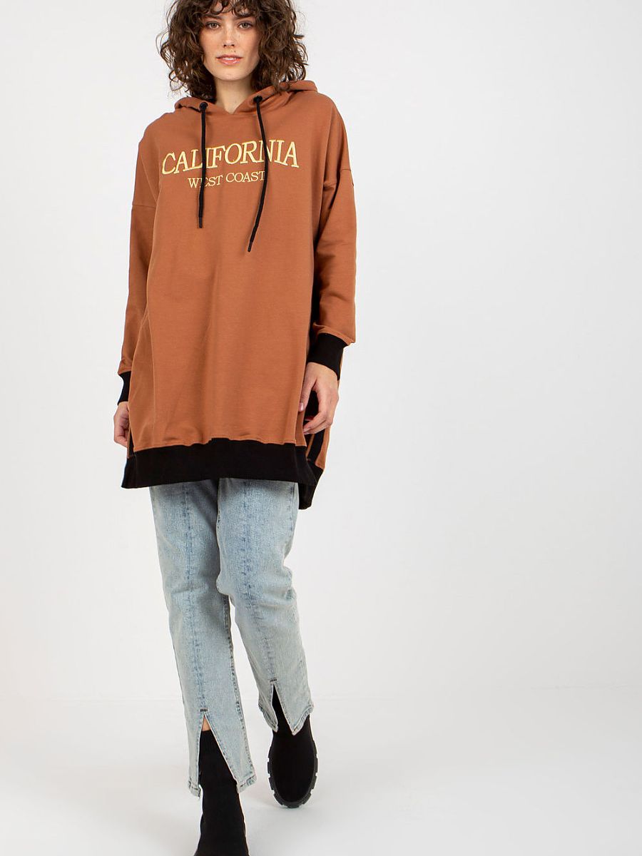 Długa damska bluza w stylu casual to idealny wybór dla kobiet ceniących komfort i prosty, nowoczesny design. Model charakteryzuje się gładkim wzorem, który nadaje uniwersalności, dzięki czemu bluza pasuje do wielu stylizacji. Wykonana z wysokiej jakości mieszanki bawełny, poliestru i elastanu, zapewnia wygodę noszenia oraz trwałość materiału. Przedłużony krój z rozcięciami po bokach dodaje lekkości i modnego wyglądu. Bluza wyposażona jest w praktyczny kaptur z troczkami, pozwalającymi na indywidualne dopasowanie. Na przodzie znajduje się stylowa naszywka z napisem, która stanowi subtelny akcent. Brak zapięcia podkreśla luźny, swobodny charakter, a długie rękawy sprawiają, że bluza doskonale sprawdzi się w chłodniejsze dni. Idealna na co dzień, do jeansów, legginsów czy wygodnych spodni.