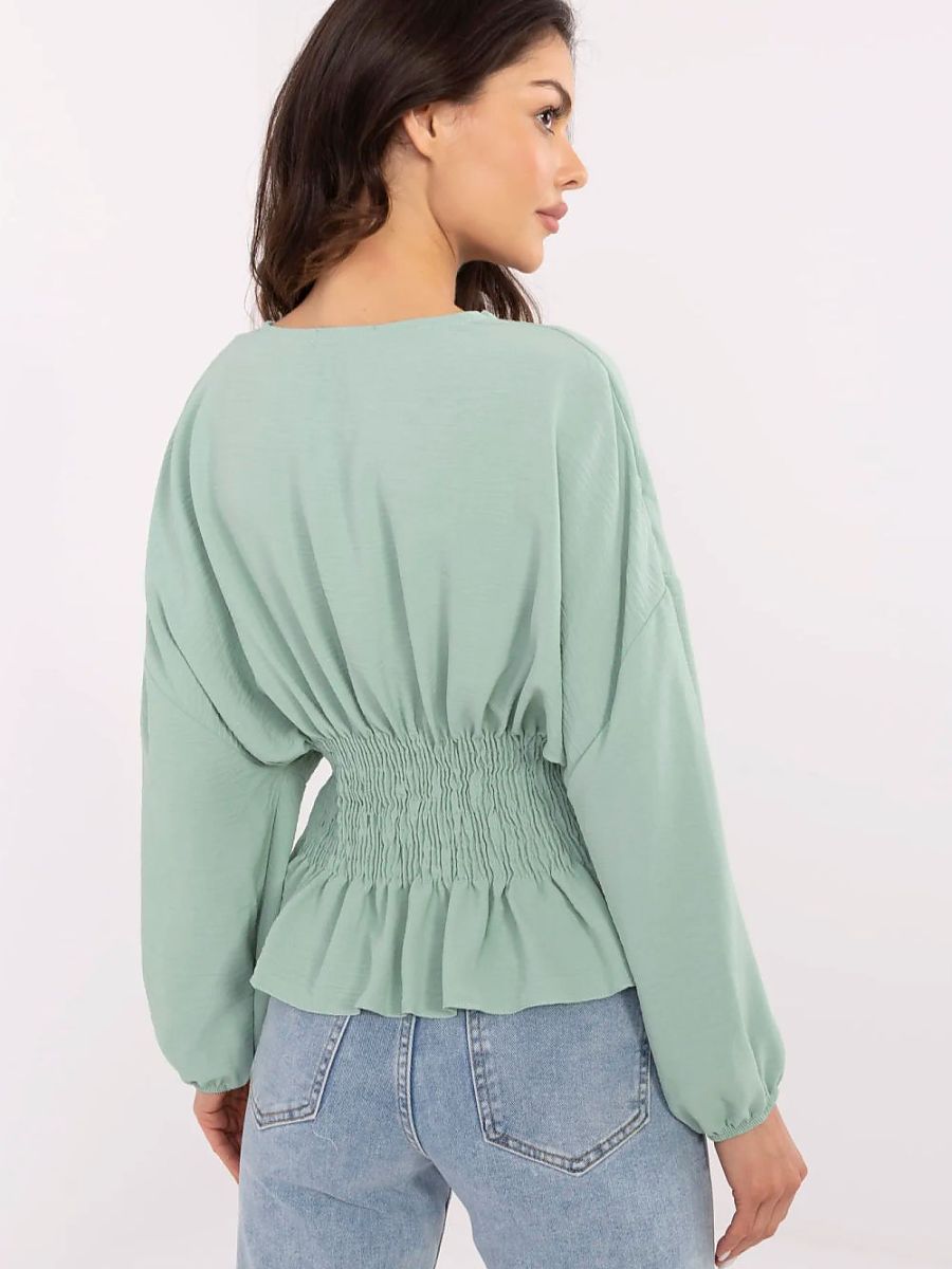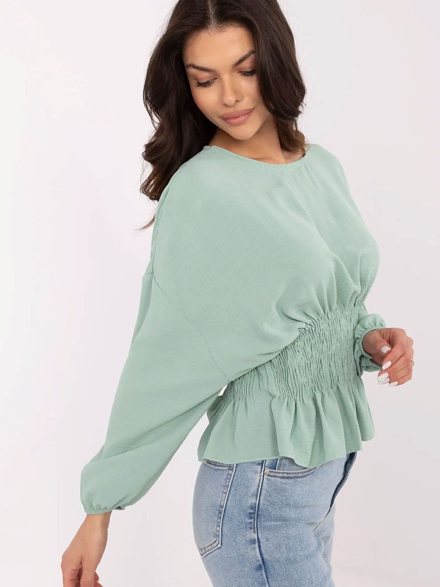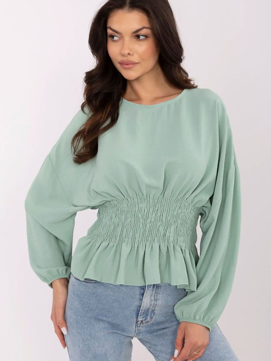 Krótka, elegancka bluzka to stylowa propozycja na co dzień, do pracy oraz na wizytowe okazje. Wykonana z gładkiego, lekkiego poliestru, łączy wygodę z szykownym wyglądem. Model zachwyca ozdobnym marszczeniem biegnącym od linii biustu aż do pasa, które subtelnie modeluje sylwetkę i dodaje jej kobiecego charakteru. Bufiaste, długie rękawy nadają całości romantycznego wyrazu, a klasyczny okrągły dekolt podkreśla elegancki styl bluzki. Brak zapięcia sprawia, że model jest wygodny i łatwy do zakładania. Idealna do spódnicy lub spodni z wysokim stanem.