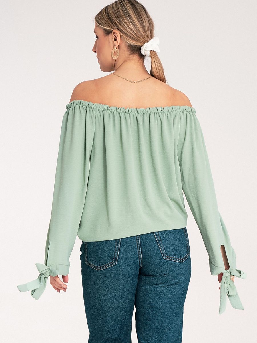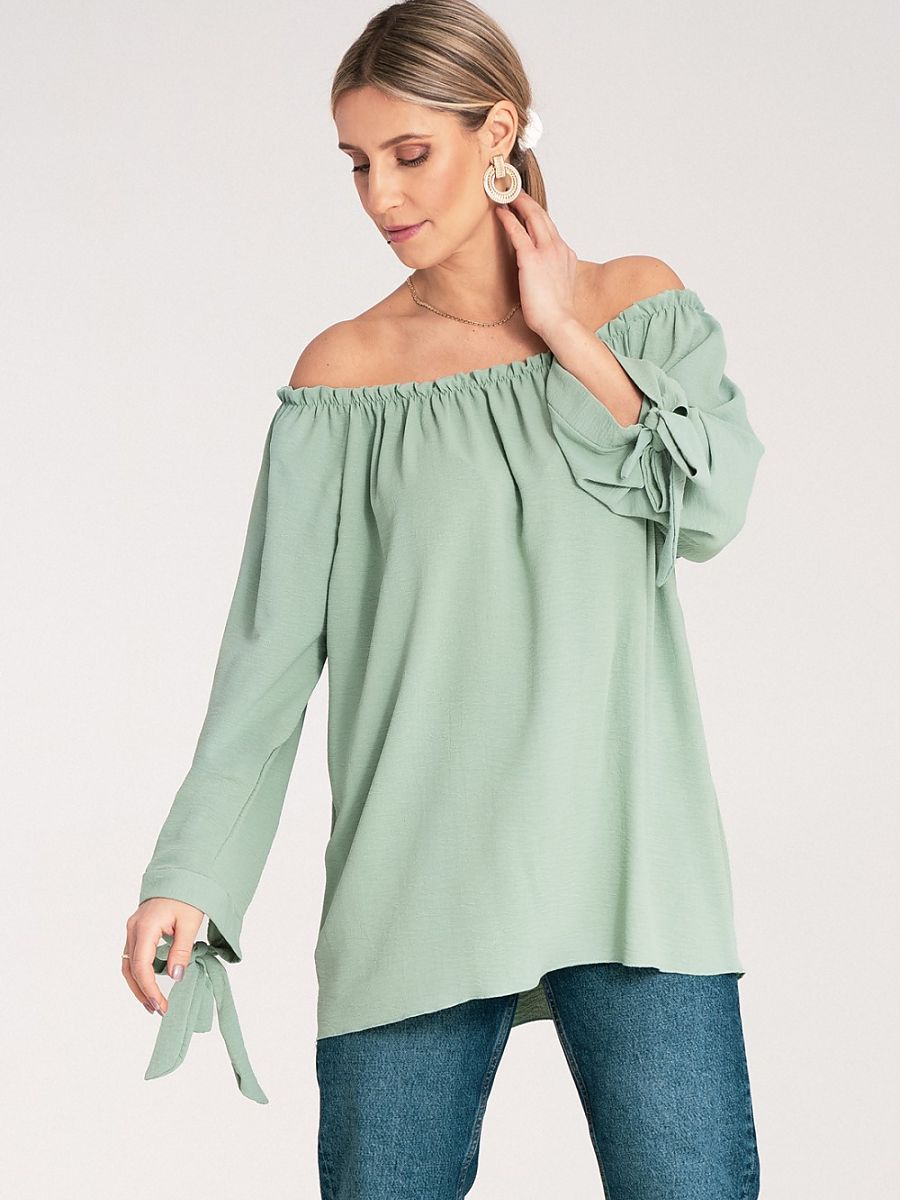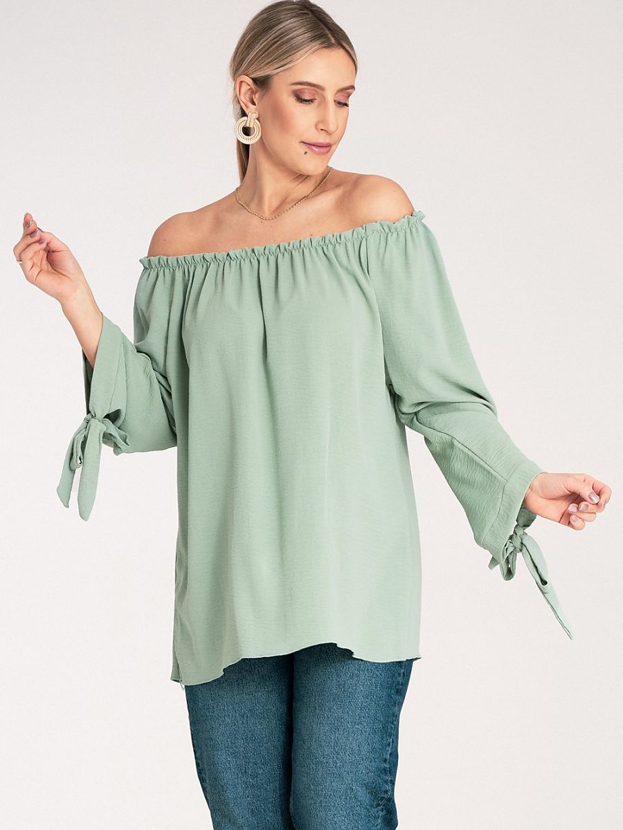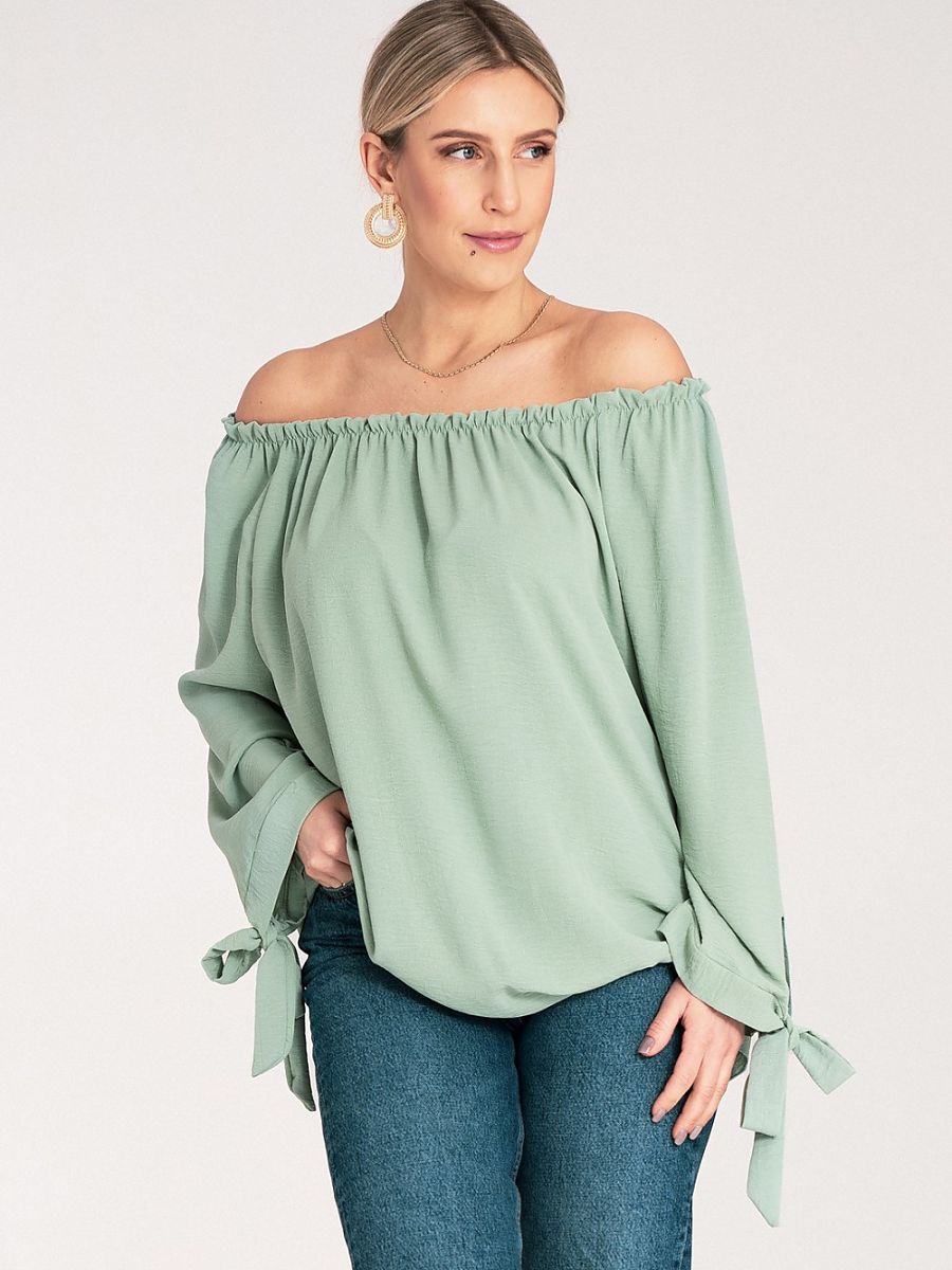 Bluzka w stylu hiszpanki z ozdobnym wiązaniem na rękawach. Model z szerokim, marszczonym dekoltem. Możliwość noszenie z odsłoniętymi ramionami.