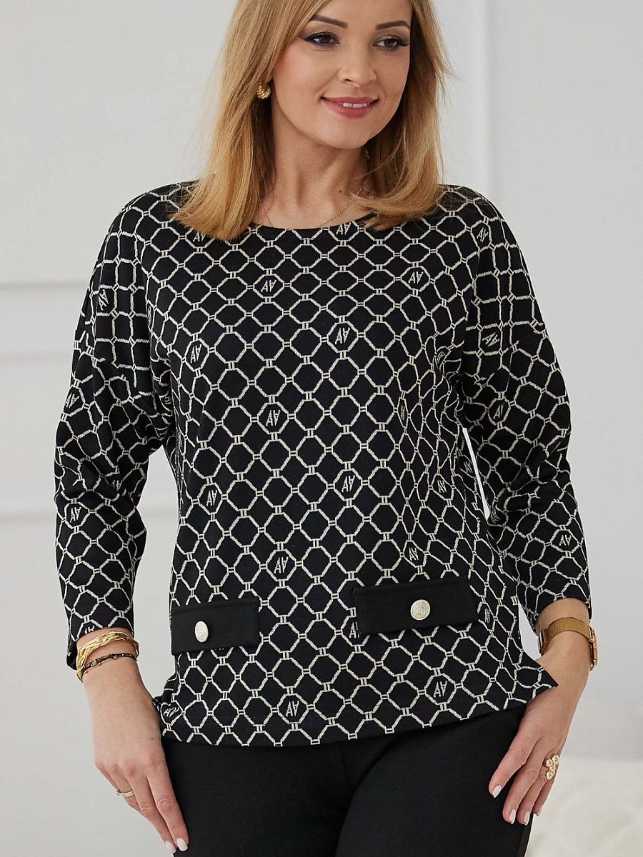 Żakardowa bluzka o klasycznym kroju z wplecioną srebrną nitką. Zaprojektowana zgodnie z zasadami marki LAAURORA czyli z myślą o kobietach dojrzałych. Dzięki swojemu wyjątkowemu fasonowi doskonale sprawdza się u Pań w większych rozmiarach. Doskonała jakość wykonania i wykończenia.