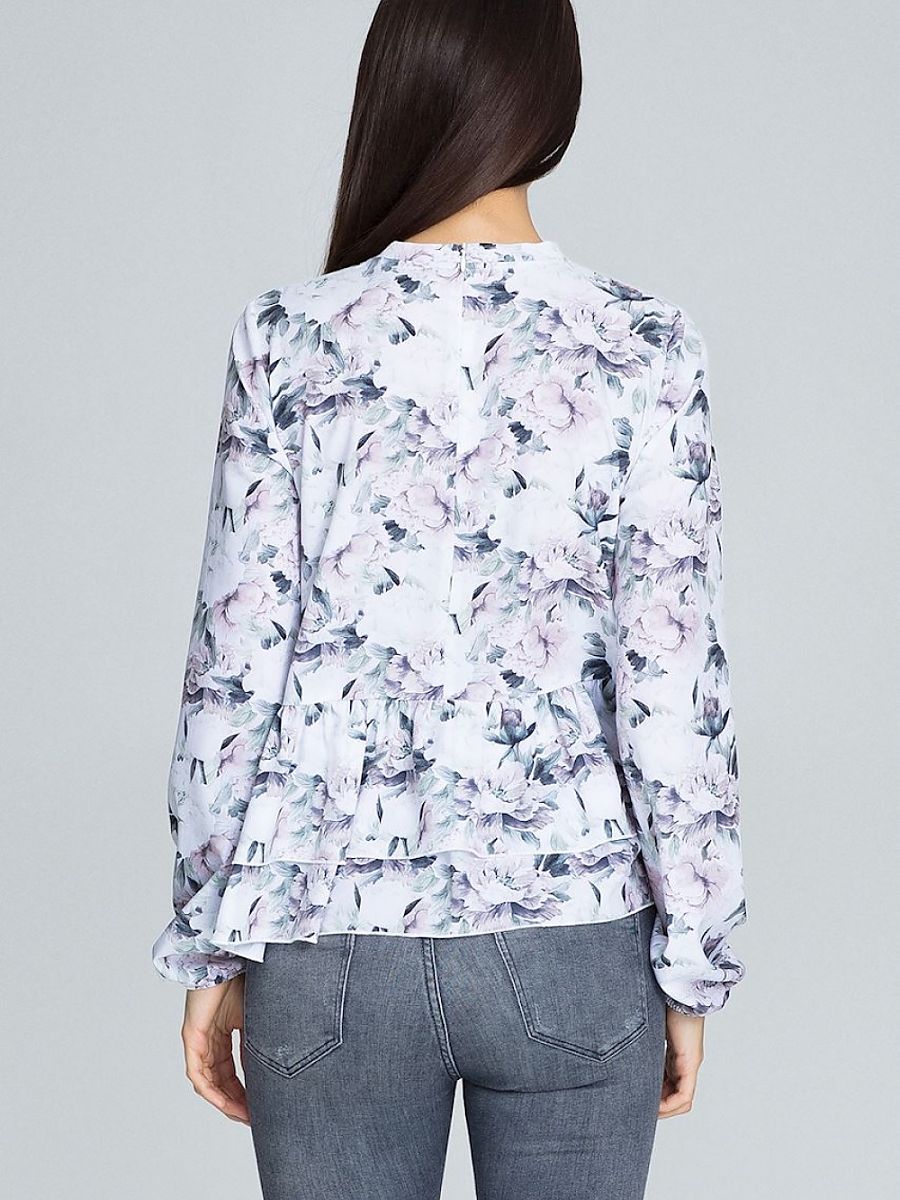 Luźna bluzka w kwiatowe wzory z długim rękawem. Dekolt na stójce, rękaw delikatnie marszczony, dwie falbanki w pasie. Model świetnie uszyty, pięknie komponuje się ze spodniami czy spódnicą, typ must have.