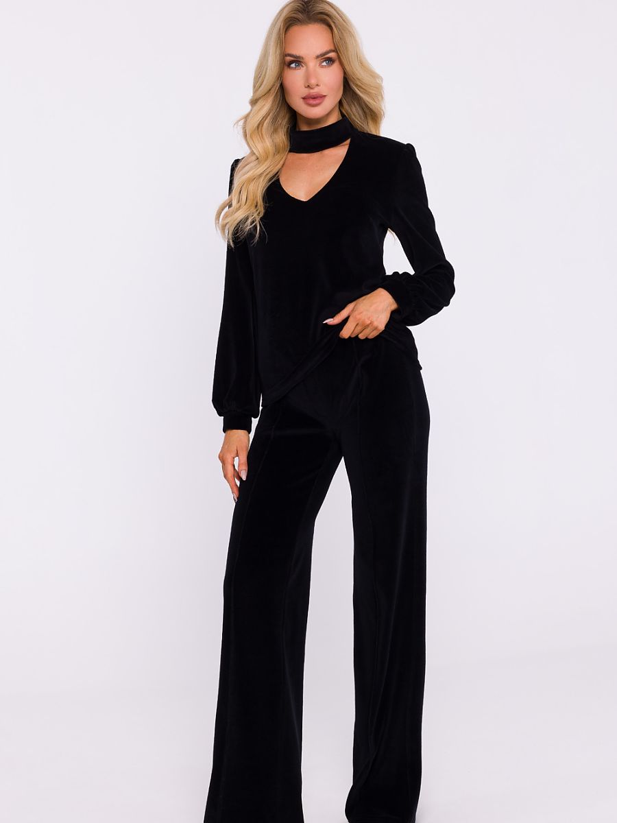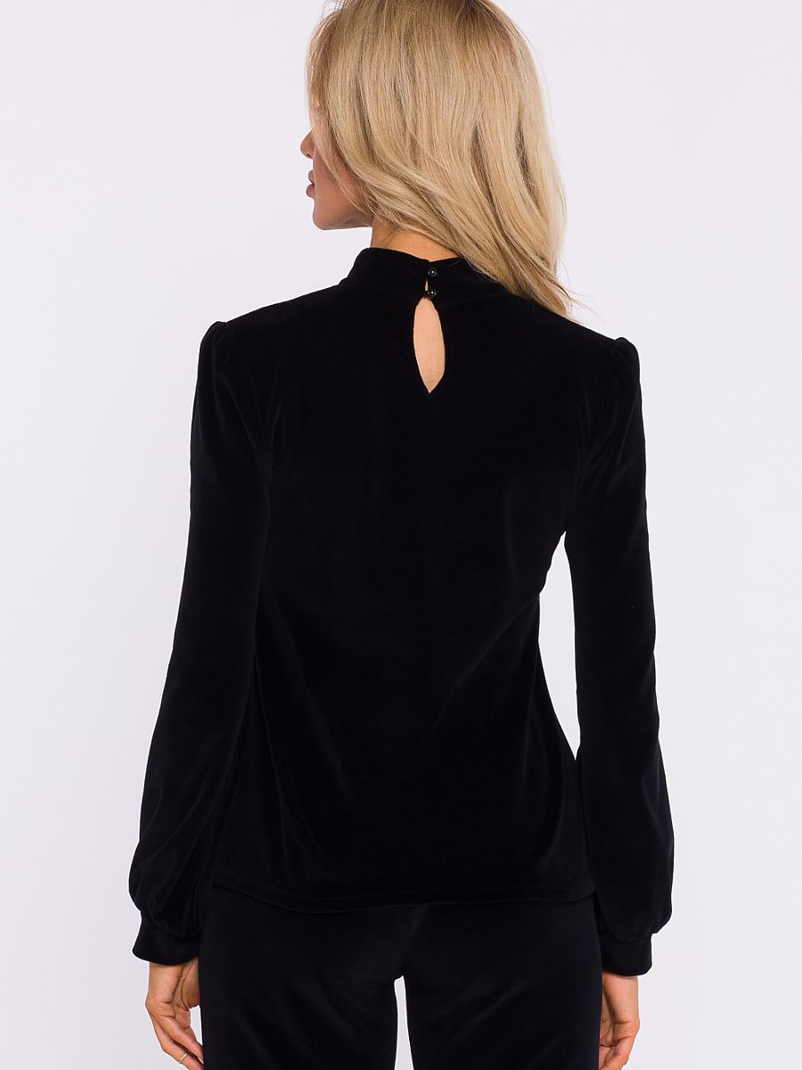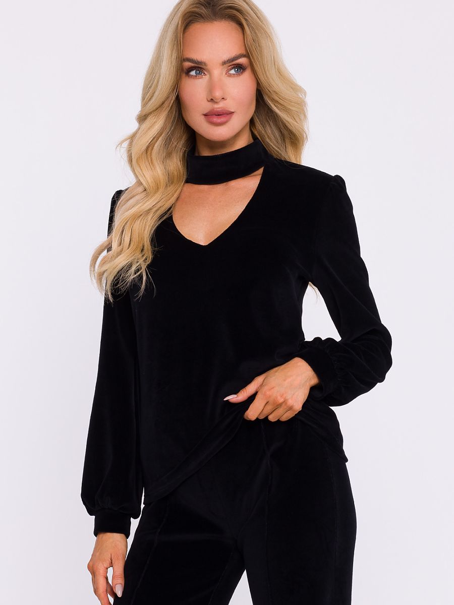 Elegancka bluzka wykonana z miękkiej, luksusowej dzianiny welurowej, zapewniającej komfort i styl. Zakładana przez głowę, z dekoltem typu halter, który zmysłowo eksponuje ramiona. Z tyłu dekolt zapinany na dwa guziki, dodając bluzce wyrafinowanego detalu. Model posiada długie, szerokie rękawy zakończone mankietami, które nadają całości elegancji i lekkości. Zaprojektowana i uszyta w Polsce, bluzka jest doskonałą propozycją na wieczorne wyjścia i stylowe okazje, łącząc wygodę z szykownym wyglądem.