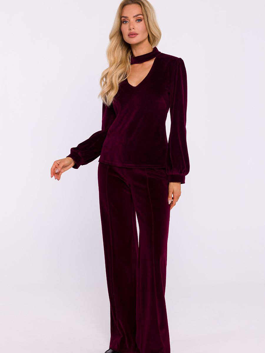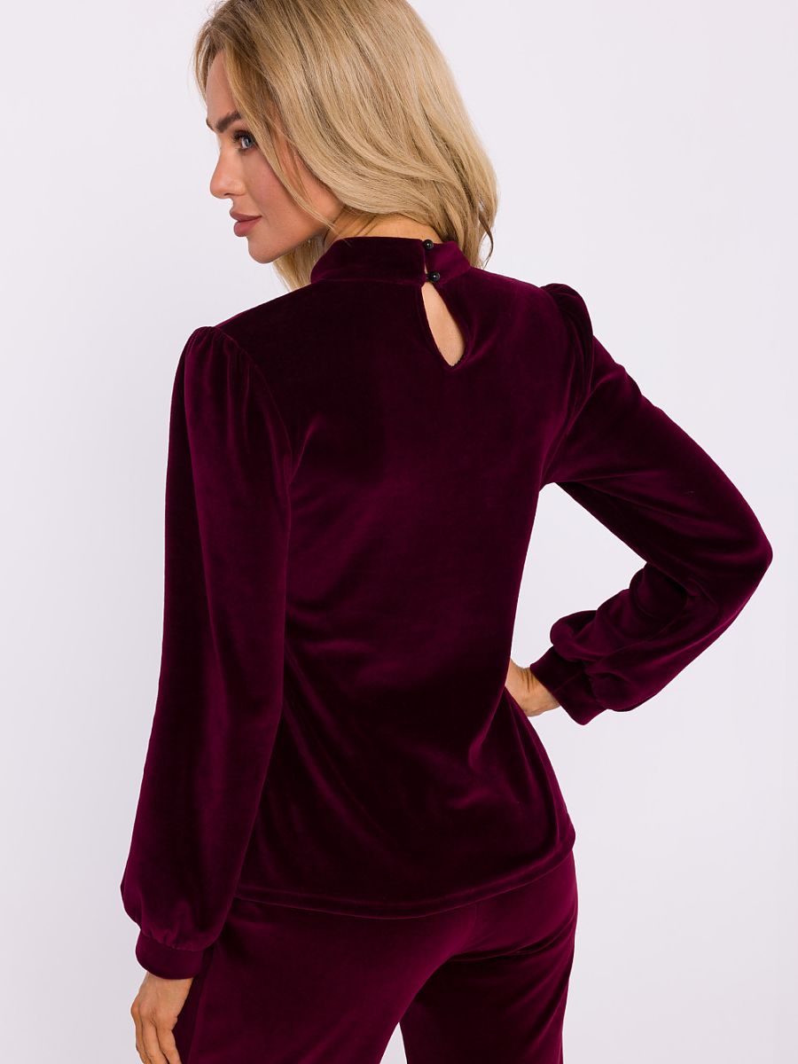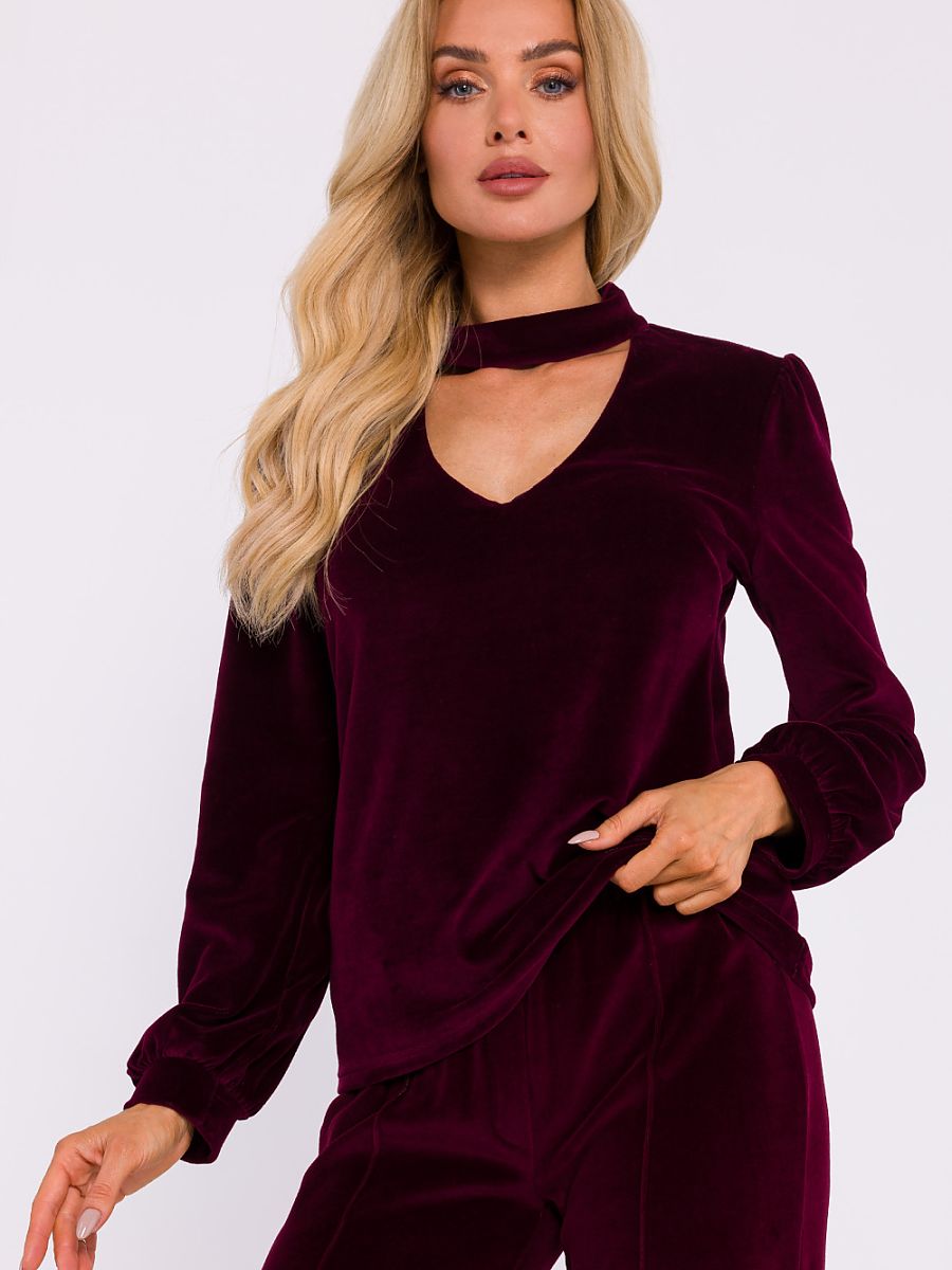 Elegancka bluzka wykonana z miękkiej, luksusowej dzianiny welurowej, zapewniającej komfort i styl. Zakładana przez głowę, z dekoltem typu halter, który zmysłowo eksponuje ramiona. Z tyłu dekolt zapinany na dwa guziki, dodając bluzce wyrafinowanego detalu. Model posiada długie, szerokie rękawy zakończone mankietami, które nadają całości elegancji i lekkości. Zaprojektowana i uszyta w Polsce, bluzka jest doskonałą propozycją na wieczorne wyjścia i stylowe okazje, łącząc wygodę z szykownym wyglądem.