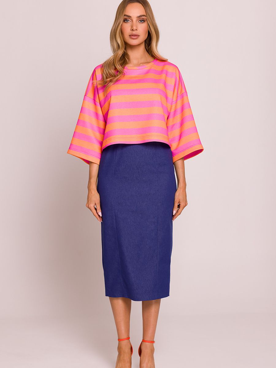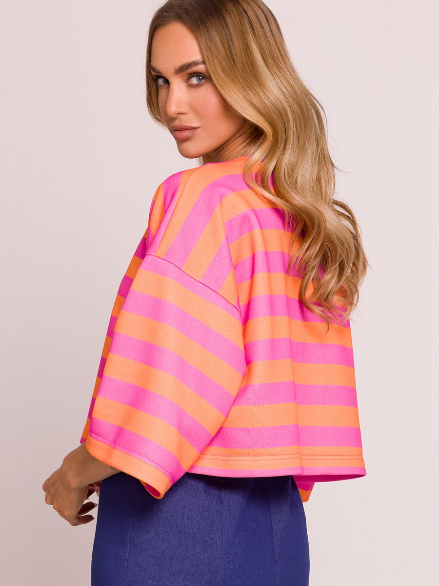 Krótka bluza oversize z dzianiny z nadrukiem w paski to idealna propozycja na codzienne stylizacje z nutą luzu. Charakteryzuje się szerokimi rękawami o długości 3/4, które dodają jej nietuzinkowego wyglądu, oraz dekoltem w kształcie łódki, który subtelnie eksponuje ramiona. Wykonana z miękkiej dzianiny, zapewnia wygodę i komfort noszenia przez cały dzień. Bluzka została zaprojektowana i uszyta w Polsce, co gwarantuje wysoką jakość i staranność wykonania. Idealna do zestawienia z jeansami, spódnicą lub sportowymi spodniami, nadaje się zarówno na casualowe, jak i bardziej eleganckie okazje.