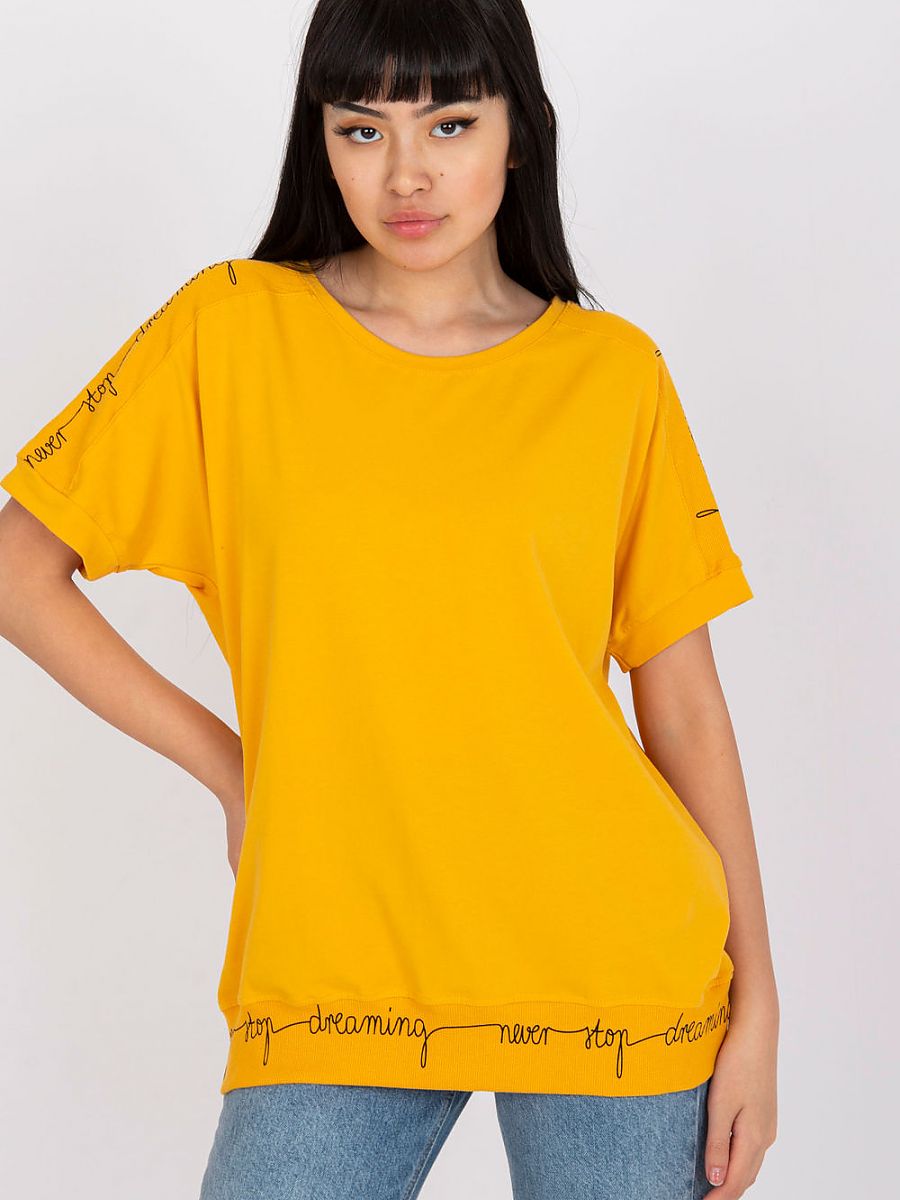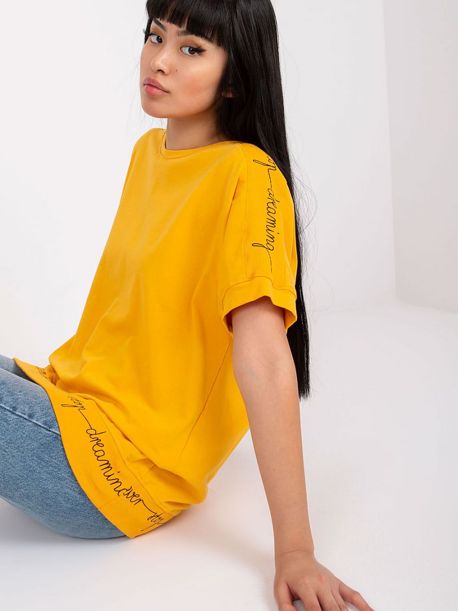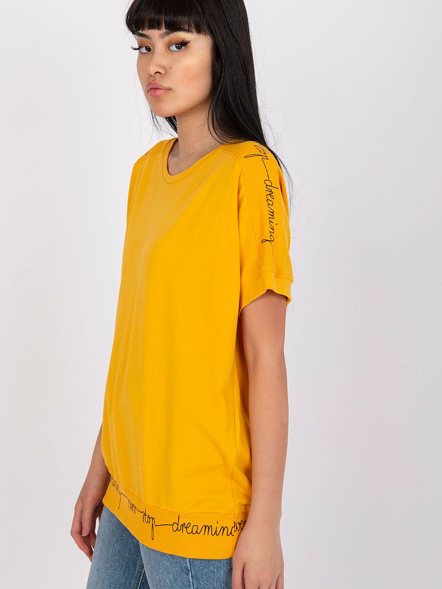 Bluzka z krótkim rękawem, dekolt okrągły. U dołu i na rękawach ozdobne napisy. Idealna propozycja na co dzień.