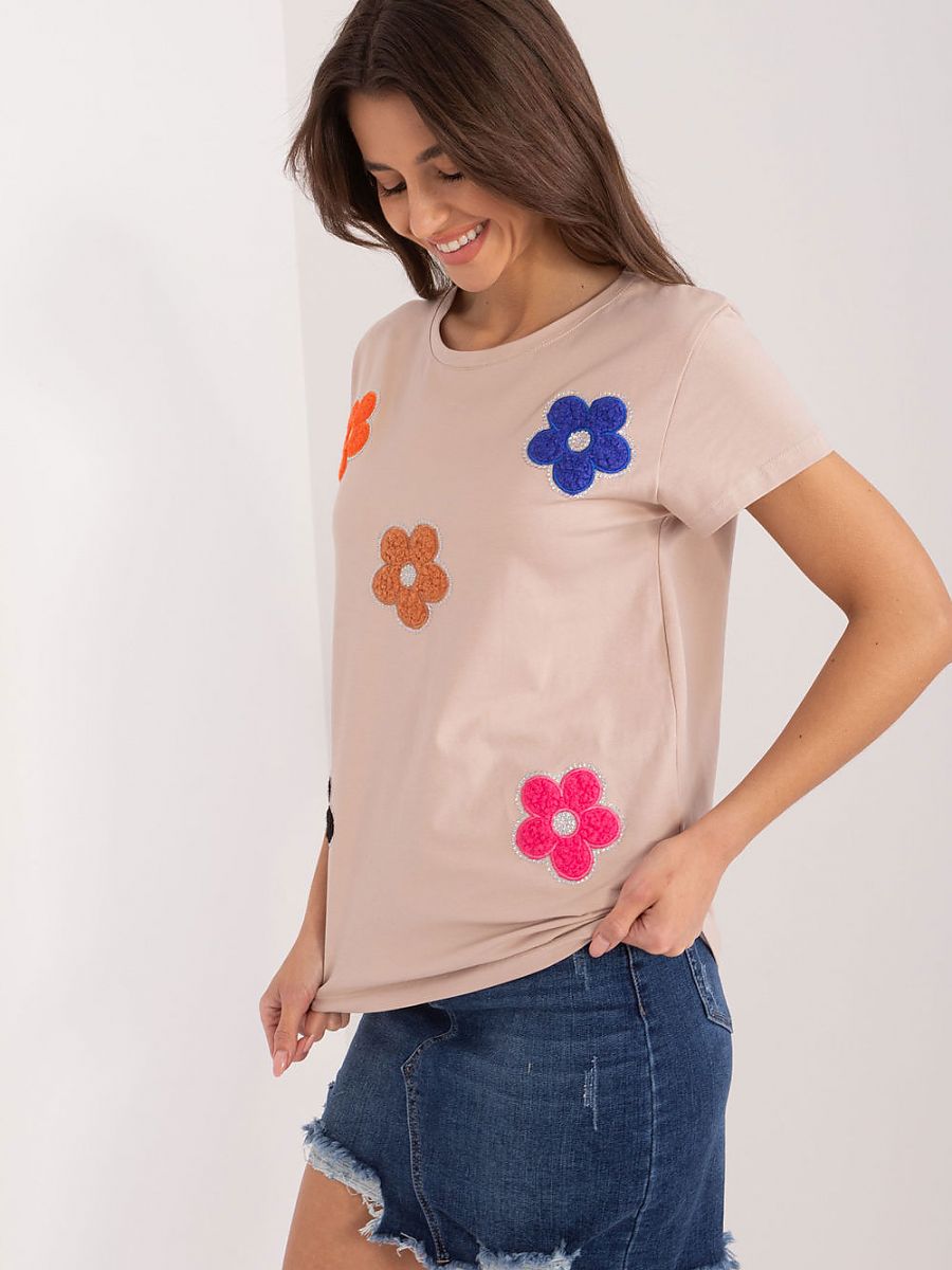 Ta bluzka to idealna propozycja dla osób poszukujących casualowego, ale uroczego elementu garderoby. Wykonana z wysokiej jakości bawełny, gwarantuje komfort noszenia przez cały dzień. Jej design skupia się na prostocie, ale ozdobiony jest subtelnie, lecz efektownie. Na przodzie znajdują się urocze kwiaty, których piękno podkreślają małe cyrkonie. To delikatne zdobienie dodaje bluzce wyjątkowego uroku i sprawia, że jest idealna na wiele okazji. Bluzka ma standardową długość i krótkie rękawy, co czyni ją idealną na letnie dni. Dekolt jest okrągły, co dodaje jej uniwersalności i sprawia, że pasuje do różnych stylizacji. To doskonały wybór dla tych, którzy cenią sobie prostotę z nutą elegancji, idealną na codzienne noszenie. Można ją łatwo zestawić z różnymi spodniami czy spódnicami, tworząc stylowe i wygodne outfit’y na co dzień.