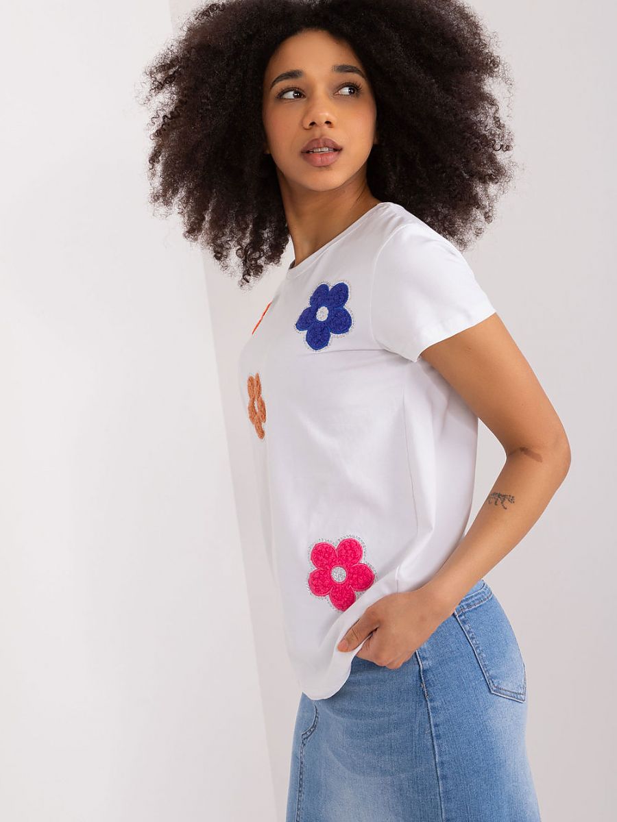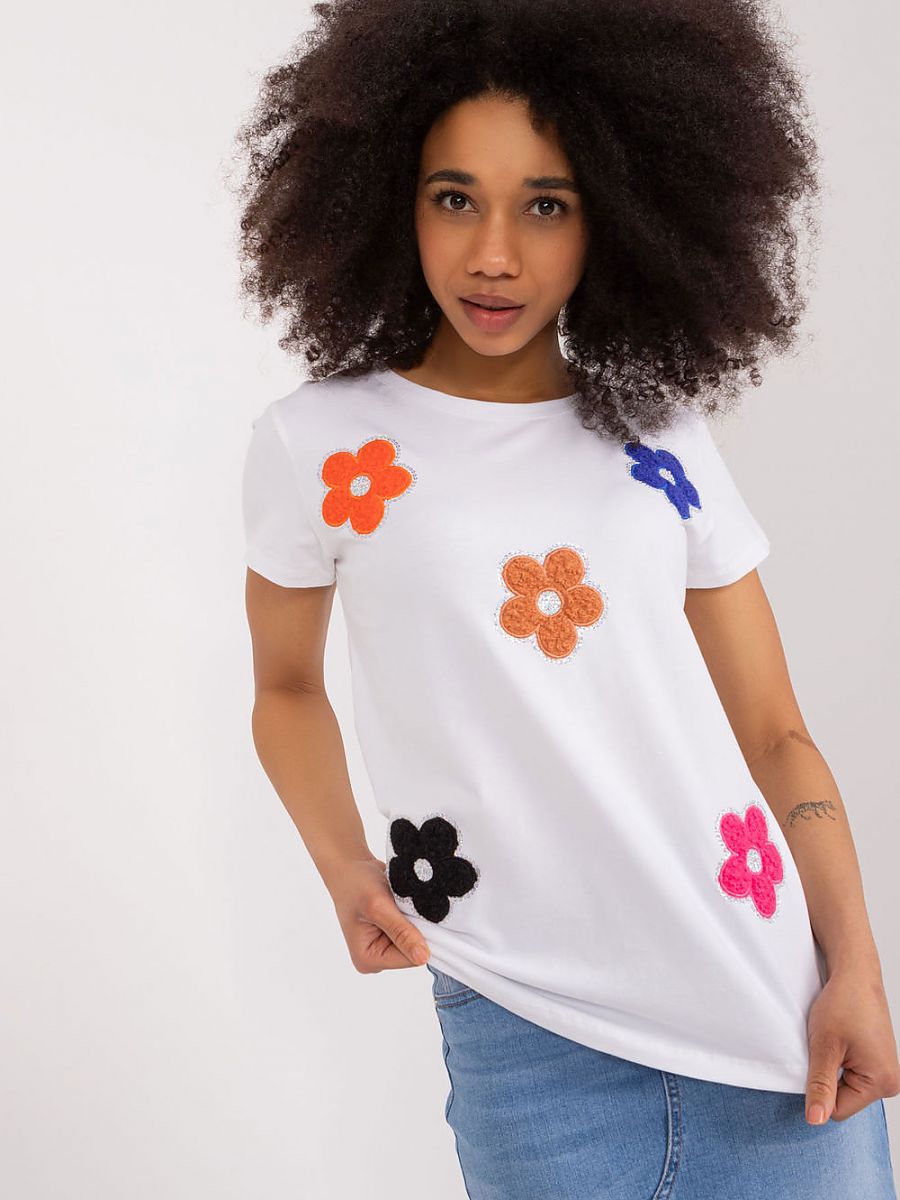 Ta bluzka to idealna propozycja dla osób poszukujących casualowego, ale uroczego elementu garderoby. Wykonana z wysokiej jakości bawełny, gwarantuje komfort noszenia przez cały dzień. Jej design skupia się na prostocie, ale ozdobiony jest subtelnie, lecz efektownie. Na przodzie znajdują się urocze kwiaty, których piękno podkreślają małe cyrkonie. To delikatne zdobienie dodaje bluzce wyjątkowego uroku i sprawia, że jest idealna na wiele okazji. Bluzka ma standardową długość i krótkie rękawy, co czyni ją idealną na letnie dni. Dekolt jest okrągły, co dodaje jej uniwersalności i sprawia, że pasuje do różnych stylizacji. To doskonały wybór dla tych, którzy cenią sobie prostotę z nutą elegancji, idealną na codzienne noszenie. Można ją łatwo zestawić z różnymi spodniami czy spódnicami, tworząc stylowe i wygodne outfit’y na co dzień.