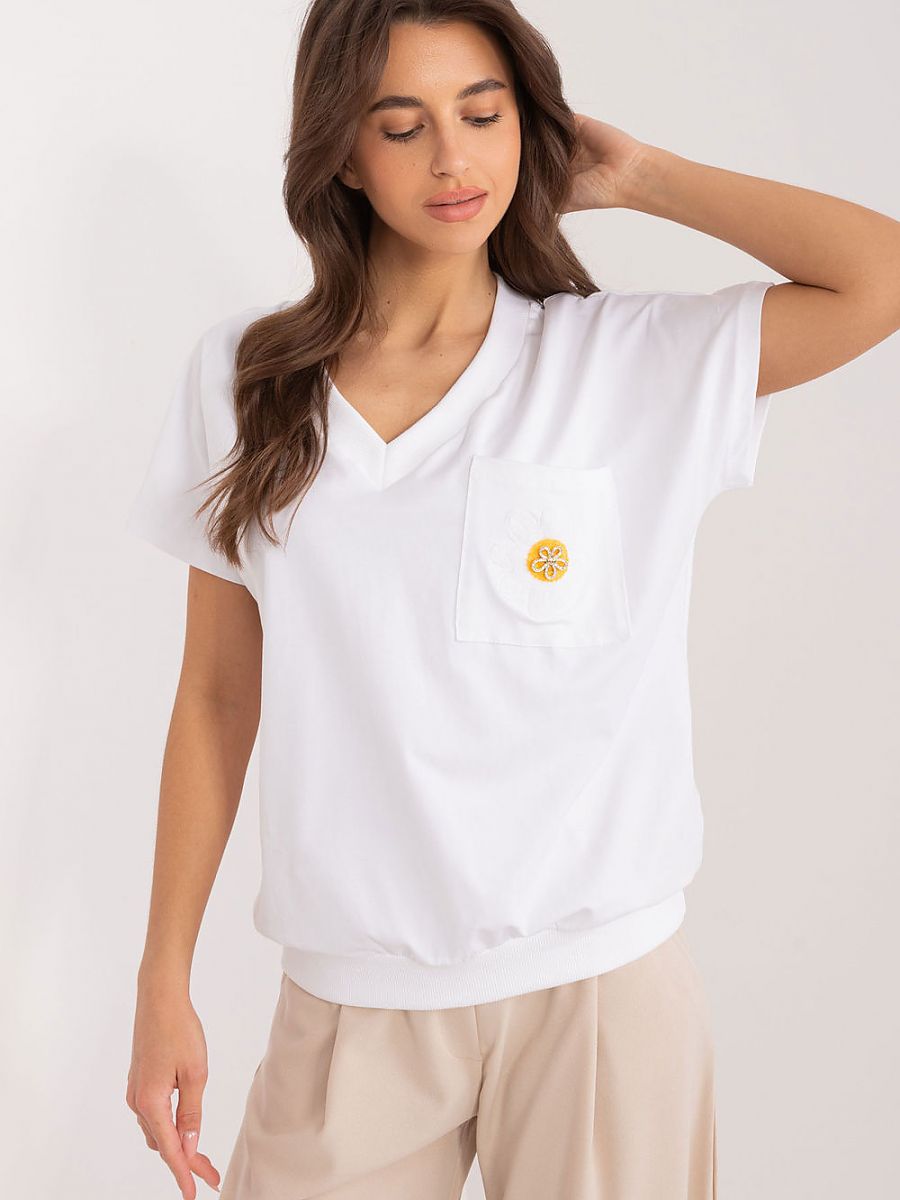 Ta codzienna bluzka to doskonały element garderoby dla tych, którzy cenią sobie wygodę w casualowym stylu, nie rezygnując przy tym z delikatnych akcentów. Jej gładki materiał z bawełny zapewnia komfort noszenia i oddychalność, sprawiając, że jest idealna na codzienne wyjścia. Bluzka ma standardową długość, co sprawia, że jest uniwersalna i odpowiednia na wiele różnych okazji. Krótki rękaw oraz dekolt w serek nadają jej swobodnego i przyjemnego charakteru, idealnie pasując do letnich dni. Główny element ozdobny to haftowany kwiat wraz z cyrkoniami umieszczonymi na kieszonce na wysokości piersi. To subtelne, ale efektowne detale dodają bluzce wyjątkowego uroku i nadają jej delikatności. Dodatkowo, kieszeń na wysokości piersi jest praktycznym elementem, umożliwiającym przechowywanie najpotrzebniejszych drobiazgów. Ta bluzka to doskonały wybór dla osób poszukujących komfortowej, ale stylowej odzieży na co dzień, dodając delikatnego uroku nawet najprostszym casualowym stylizacjom.
