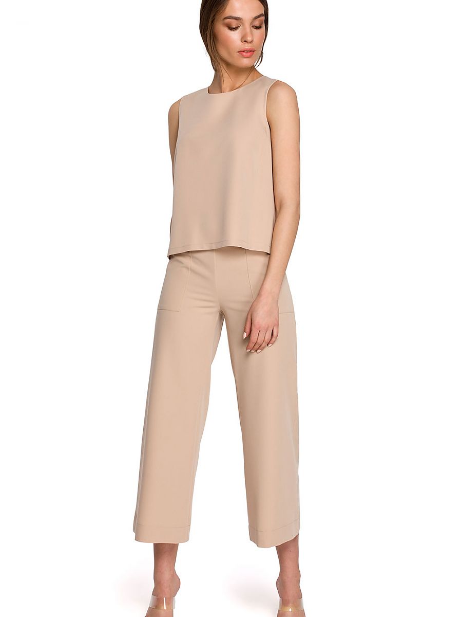 Krótka bluzka bez rękawów o fasonie trapezowym z delikatnym wycięciem w dekolcie z tyłu. To propozycja zarówno dla fanek klasycznej elegancji ale i dla bardziej wymagających poszukiwaczek modnych elementów garderoby. Bluzka zapinana na kryty zamek.