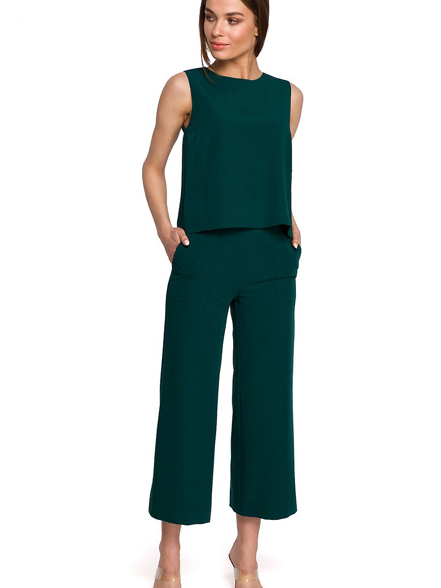 Krótka bluzka bez rękawów o fasonie trapezowym z delikatnym wycięciem w dekolcie z tyłu. To propozycja zarówno dla fanek klasycznej elegancji ale i dla bardziej wymagających poszukiwaczek modnych elementów garderoby. Bluzka zapinana na kryty zamek.
