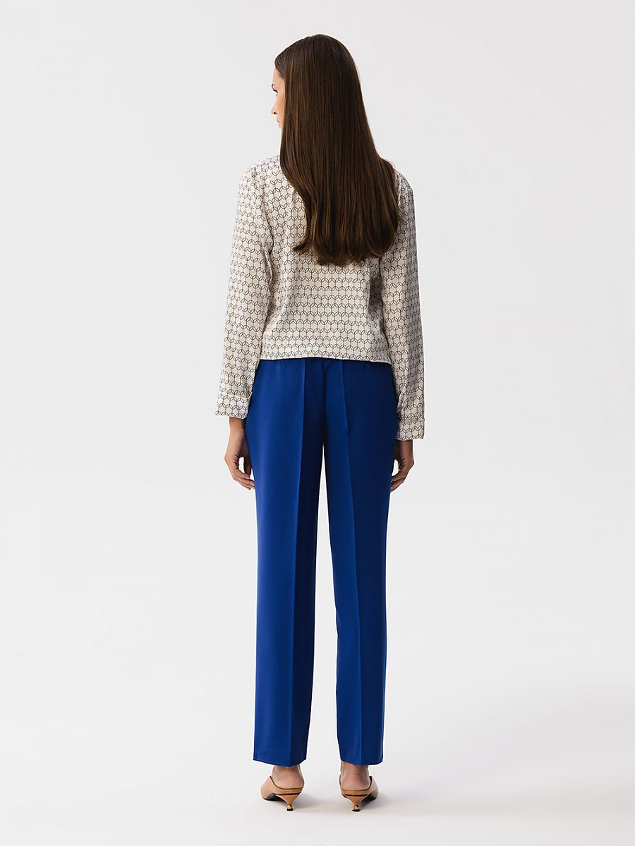 Ta bluzka to połączenie elegancji i wygody. Wykonana z tkaniny satynowej z nadrukiem, prezentuje się wyjątkowo. Jej fason kopertowy z kołnierzykiem dodaje uroku i szyku. Dekolt jest zapinany na mini napę, co nadaje bluzce subtelności. Długie rękawy zakończone mankietami zapinanymi na guzik dodają elegancji i pozwalają dostosować długość rękawów. Dół bluzki zakończony gumą zapewnia komfort noszenia i podkreśla talię. To bluzka, która świetnie sprawdzi się zarówno na bardziej formalnych okazjach, jak i podczas codziennych stylizacji, dodając nutkę wyjątkowości. Zaprojektowana i uszyta w Polsce.