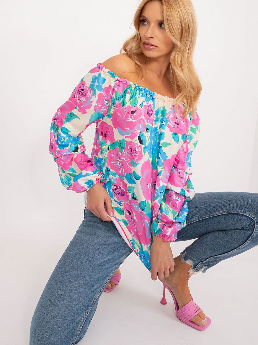 Ta bluzka to idealna propozycja na codzienne stylizacje, łącząc w sobie wygodę casualowego looku z subtelnym urokiem wizytowych detali. Jej materiał w kolorowe kwiaty dodaje bluzce świeżości i lekkości, idealnie pasując do letniej aury. Wykonana głównie z poliestru, bluzka jest przyjemna w dotyku oraz łatwa w utrzymaniu. Długi bufiasty rękaw nadaje bluzce dziewczęcego uroku i delikatności, podkreślając jednocześnie letni nastrój. Dekolt typu hiszpanka eksponuje subtelnie odsłonięte ramiona, dodając bluzce lekkości i romantyzmu. Marszczenia przy dekolcie nadają bluzce elegancki akcent, nadając jej niepowtarzalnego charakteru. Bluzka ma standardową długość, co sprawia, że jest odpowiednia na różne okazje, od pracy po spotkania ze znajomymi. Jej uniwersalny styl casualowy pozwala na zestawienie jej zarówno z jeansami, jak i spódniczką, nadając całości świeżego i modnego wyglądu. Ta bluzka to doskonały wybór dla kobiet ceniących sobie wygodę i subtelny, ale stylowy wygląd na co dzień.