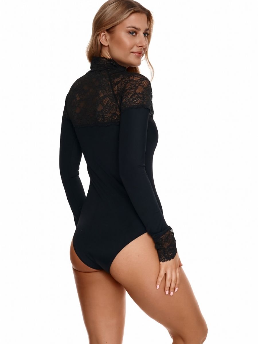 Eleganckie body z golfem, modne, a zarazem szykowne z najnowszej kolekcji. Wykonane z połączenia czarnej, gładkiej mikrofibry, oraz wtwornej koronki, która dodaje całości seksapilu oraz zmysłowości. Body świetnie komponuje się ze spódniczką jak i w wydaniu sportowym ze spodenkami.