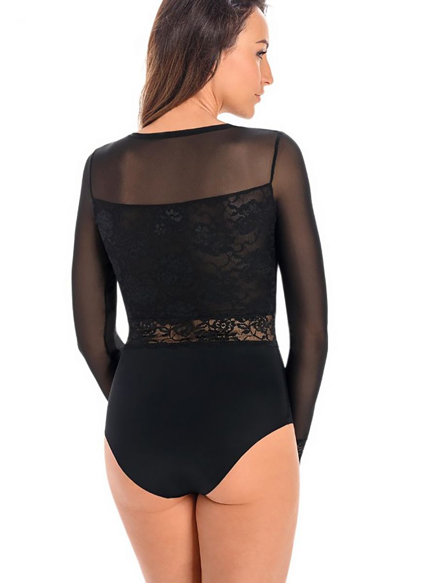 Damskie body koronkowe z częścią majtkową modelującą partie brzucha w kolorze czarnym. Wykonane są z efektownej koronki o gęstym motywie kwiatowym. Koronka zdobi pas, górą kryta jest przez delikatną, drobną prześwitującą siatkę. Rękaw jest długi, dopasowany, wykonany z prześwitującej siatki i wykończony koronką. W kroku body damskie zapinane są na regulowane haftki. Dzięki temu body są bardzo wygodne w codziennym użytkowaniu. W połączeniu ołówkową spódnicą będą tworzyć niezwykle kobiecy zestaw na co dzień i na wieczory z przyjaciółmi.