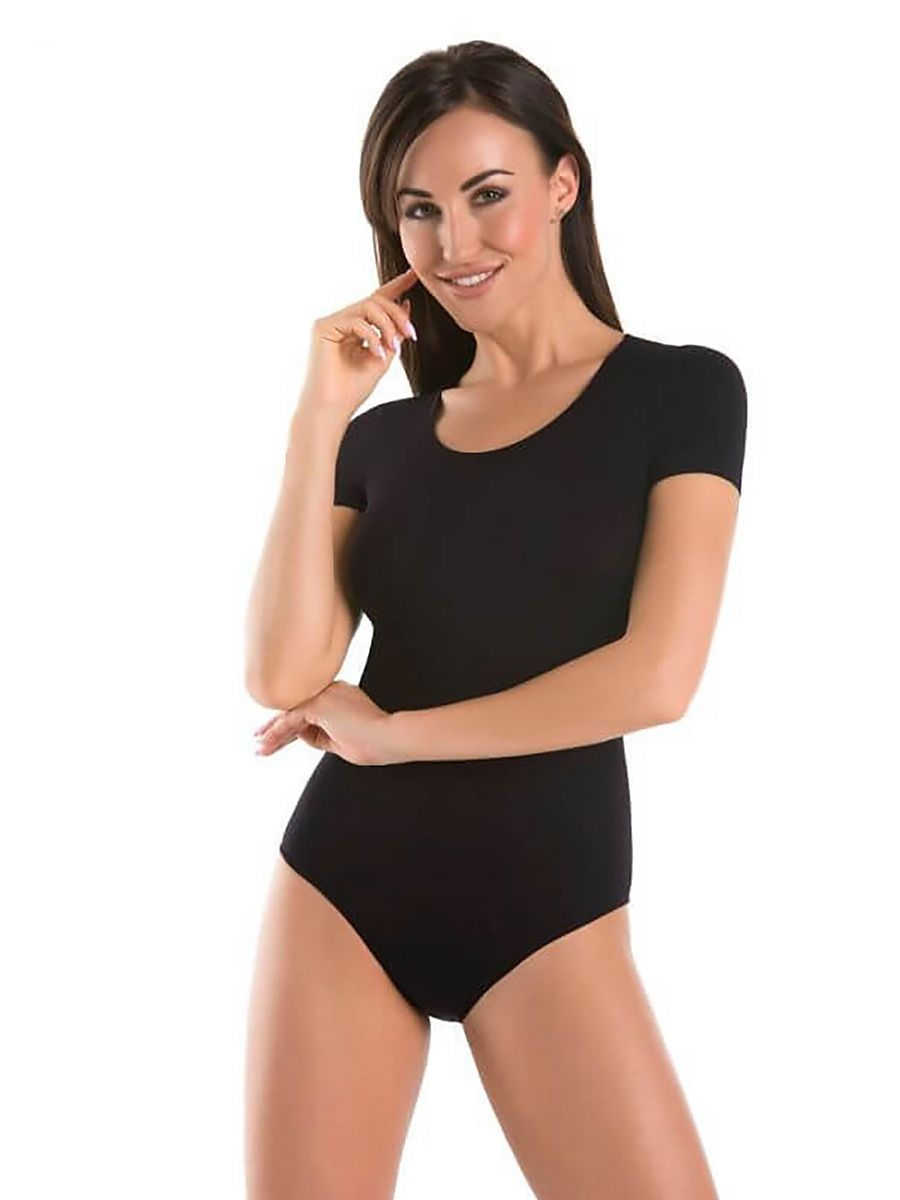 Klasyczne body damskie uszyte z wiskozy z dodatkiem włókna lycry. Są bardzo elastyczne i doskonale dopasowują się do sylwetki i nie prześwitują. Wokół szyi wykończone są na półokrągło i posiadają krótki, dopasowany rękaw. Na dole wokół kroku znajduje się zapięcie na haftki, które pozwala na dobre wyregulowanie długości. Wokół nóg obszyto je delikatnymi gumkami, które dobrze dopasowują się do ud. Z przodu, body są delikatnie wycięte, a z tyłu kryją pośladki. Dodatkowo w kroku zastosowano podszycie bawełniane, które pozwala zachować maksimum komfortu i higieny. Klasyczne body w kolorze czarnym sprawdzi się do każdego elementu garderoby, ze względu na swoją uniwersalność. W połączeniu z dżinsami body damskie tworzą efektowny duet na wieczorne wyjścia.