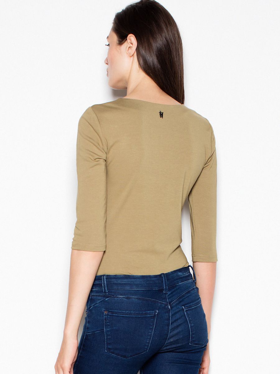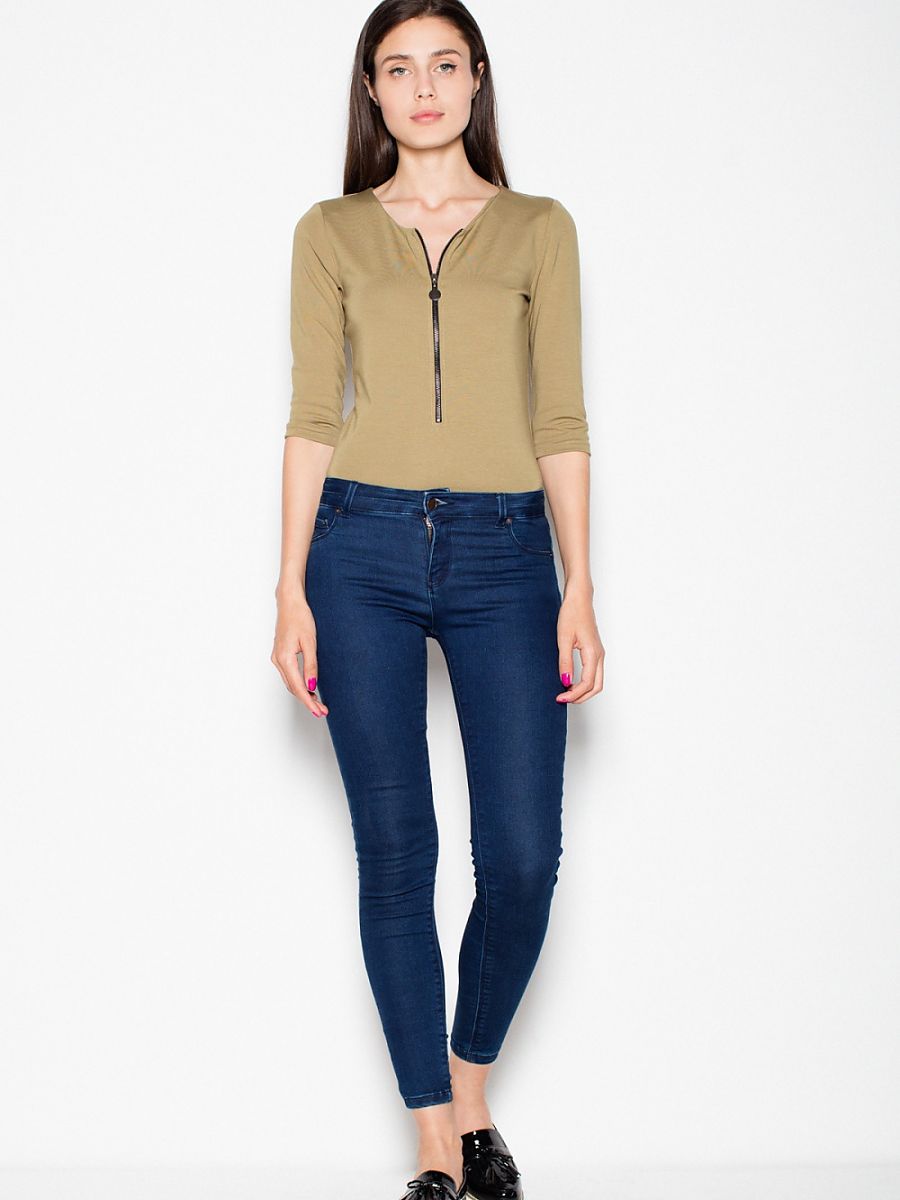 Dopasowane, kobiece, body, z 3/4 rękawem. Zapinane na ozdobny suwak. Idealne do dopasowanych jeansów.