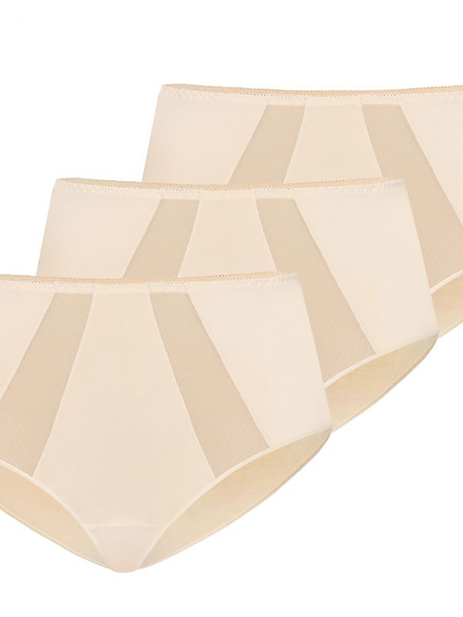 Wielopak majtek damskich w kolorze beżowym, który jest niewidoczny spod białej odzieży, ponieważ zlewa się z odcieniem skóry. Majtki w zestawie są bardzo efektowne, z przodu po obu stronach zdobione delikatną wszytą po skosie pionowo prześwitującą siatką, która podnosi walory estetyczne. Trójpaki są bardzo chętnie nabywane, ponieważ ich cena jest atrakcyjna, a ponadto stanowią idealny pomysł na prezent dla swojej wybranki. Każda kobieta ceniąca sobie dobry wygląd powinna posiadać je w swojej damskiej garderobie. Majtki w zestawie posiadają wysoki stan do pępka, maskują mankamenty kobiecej sylwetki, sprawdzają się pod dopasowaną odzieżą. Są bardzo wygodne i komfortowe w użytkowaniu. Od wewnętrznej strony w okolicach kroku podszyte są podwójną warstwą bawełny absorbującej wilgoć i gwarantującej utrzymanie świeżości w trakcie noszenia. Z tyłu kryją całe pośladki i eksponują pupę. Wokół ud obszyte cienką elastyczną gumką, która nie zostawia śladów na skórze, w pasie również delikatną gumką podtrzymującą. Majtki występujące w zestawie wykonane są z wysokiej jakości przewiewnej bawełny z dodatkiem elastycznego włókna lycry, które gwarantuje dłuższe użytkowanie. Ponadto dzięki lycrze majtki po praniu nie zmieniają swojego pierwotnego fasonu.