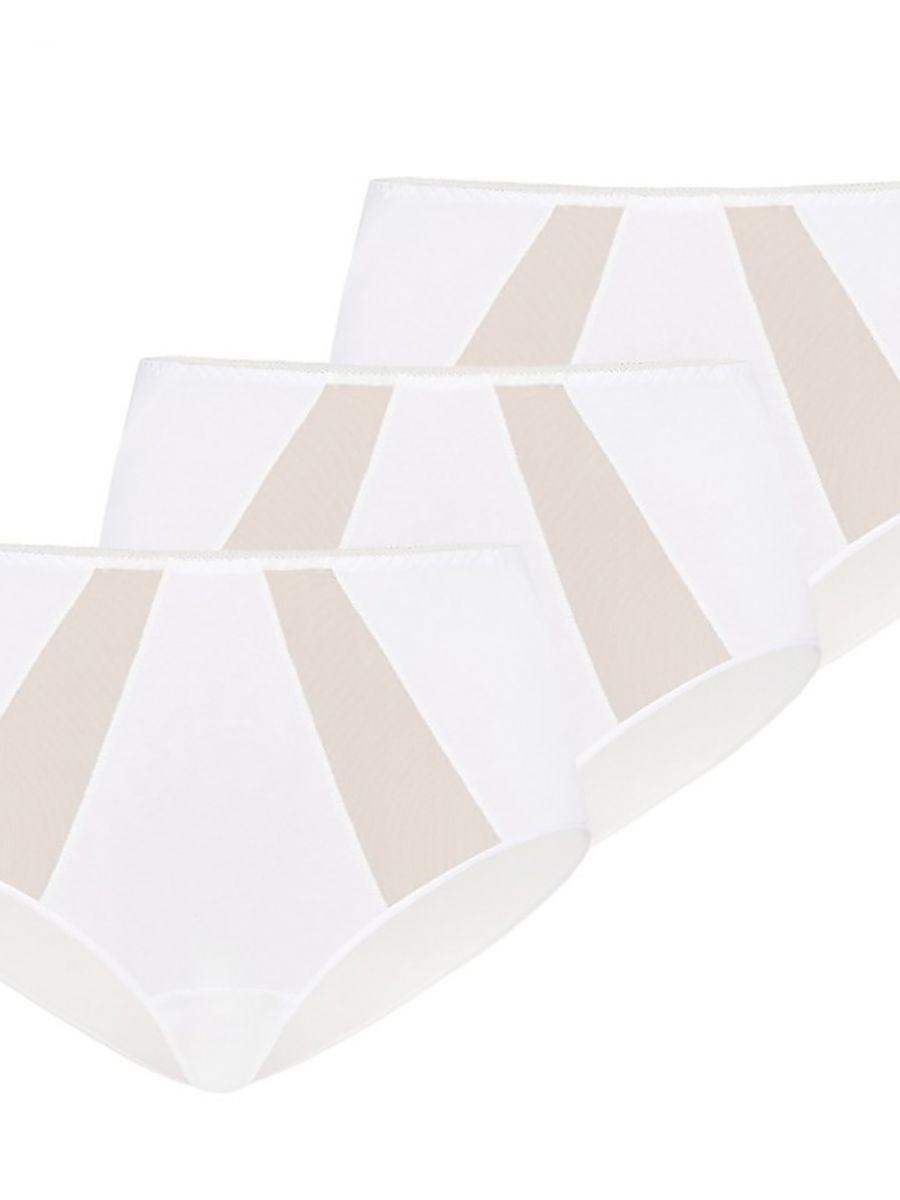 Zestaw trzech sztuk majtek damskich z wysokim stanem w kolorze białym. Majtki wykonane są z wysokogatunkowej bawełny, która jest bardzo przyjemna w dotyku i dla kobiecego ciała. W okolicach kroku od wewnętrznej strony majtki podszyte są dodatkową warstwą przewiewnej bawełny, która gwarantuje utrzymanie świeżości i komfort w codziennym użytkowaniu. Wielopaki majtek cieszą się dużym zainteresowaniem wśród kupujących z uwagi na dużo niższą cenę, są również doskonałym pomysłem na prezent dla swojej wybranki na różne okazje i bez okazji. Z przodu po bokach majtki zestawione są z efektowną o drobnym splocie prześwitującą siatką, która wszyta jest ukośnie. Pas i wokół ud majtki obszyte są delikatną elastyczną gumką, która nie ociera i nie zostawia śladów na skórze. Majtki w trójpaku posiadają wysoki stan sięgający do pępka, z boku wyżej zabudowane, dzięki temu zakrywają kobiece niedoskonałości i eksponują zalety sylwetki. Z tyłu są mocniej zabudowane, kryją całe pośladki. Są bardzo wygodne i komfortowe w użytkowaniu, i niewidoczne spod dopasowanej sukienki czy spódnicy. Białe majtki z wysokim stanem idealnie skomponują się z jasnym wierzchnim okryciem. Każda kobieta ceniąca sobie wygląd i komfort powinna posiadać je w swojej garderobie.