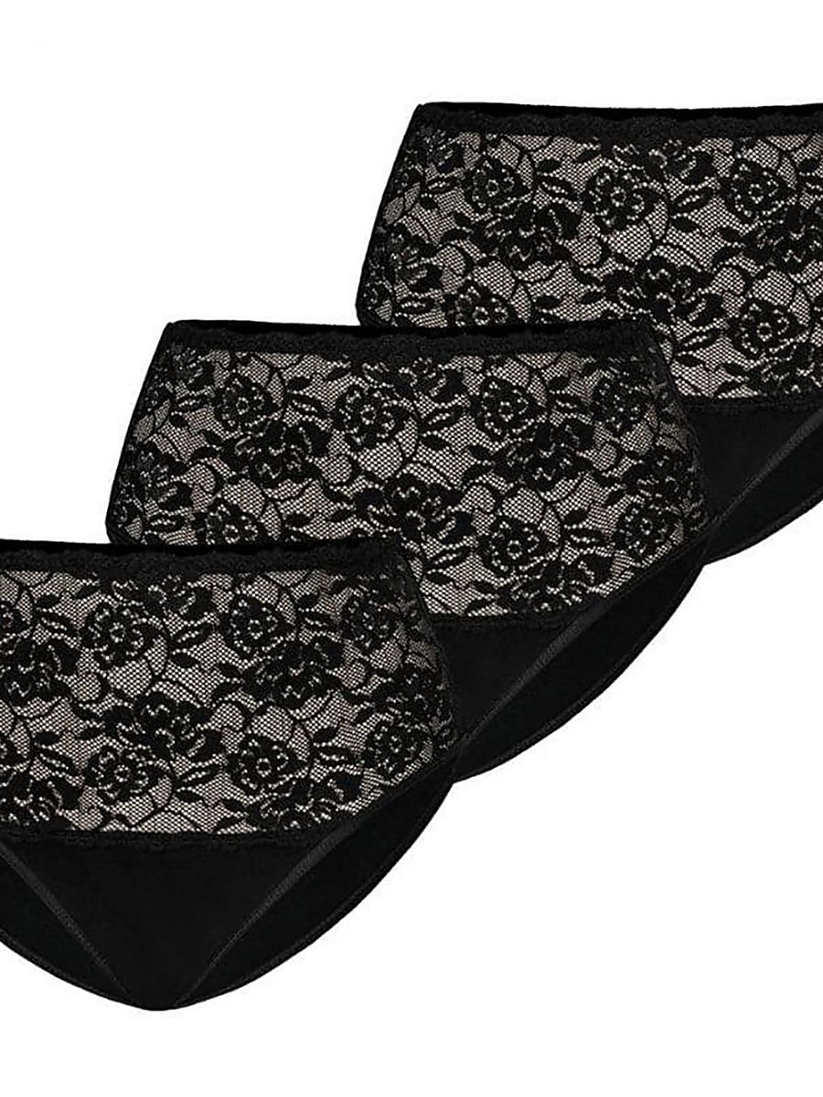 Trójpak majtek damskich z wysokim stanem w kolorze czarnym. Zestawy cieszą się na rynku dużą popularnością wśród kupujących z uwagi na atrakcyjną cenę. Majtki wykonane są z bawełny z dodatkiem elastycznej nici lycry, z przodu zdobione efektowną koronką o wzorze kwiatowym. Wielopaki fig damskich są dobrym pomysłem na prezent.