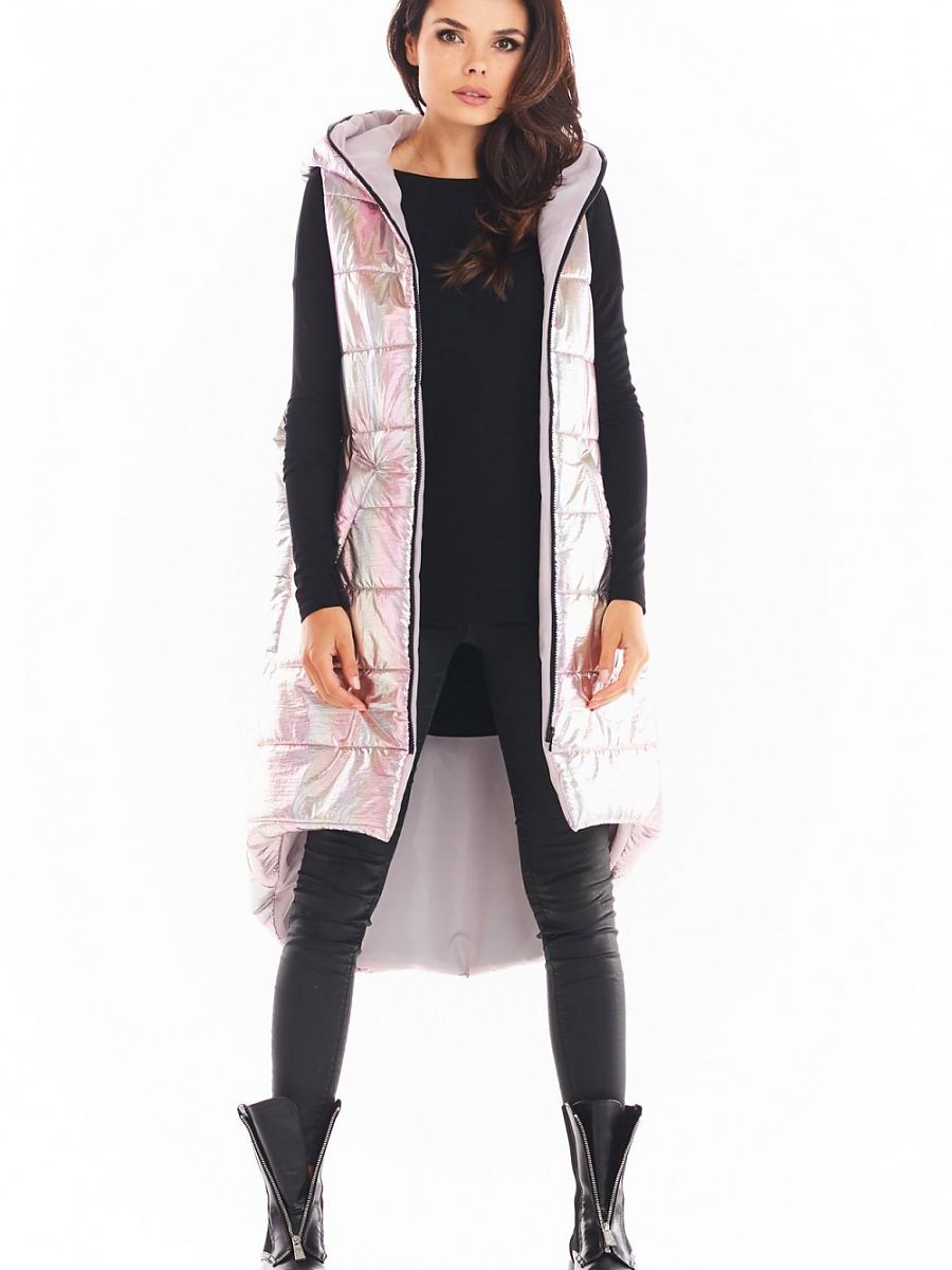 Holograficzna kamizelka z przedłużanym tyłem to idealny wybór na chłodne, jesienne dni. Jej ciekawe kolory przykują wzrok i dodadzą stylizacji charakteru. Zapinana na zamek, z dużym kapturem i pojemnymi kieszeniami. Mamy ją w 3 odcieniach: niebieskim, miętowym i różowym. Materiał: Podszewka 100% poliester.