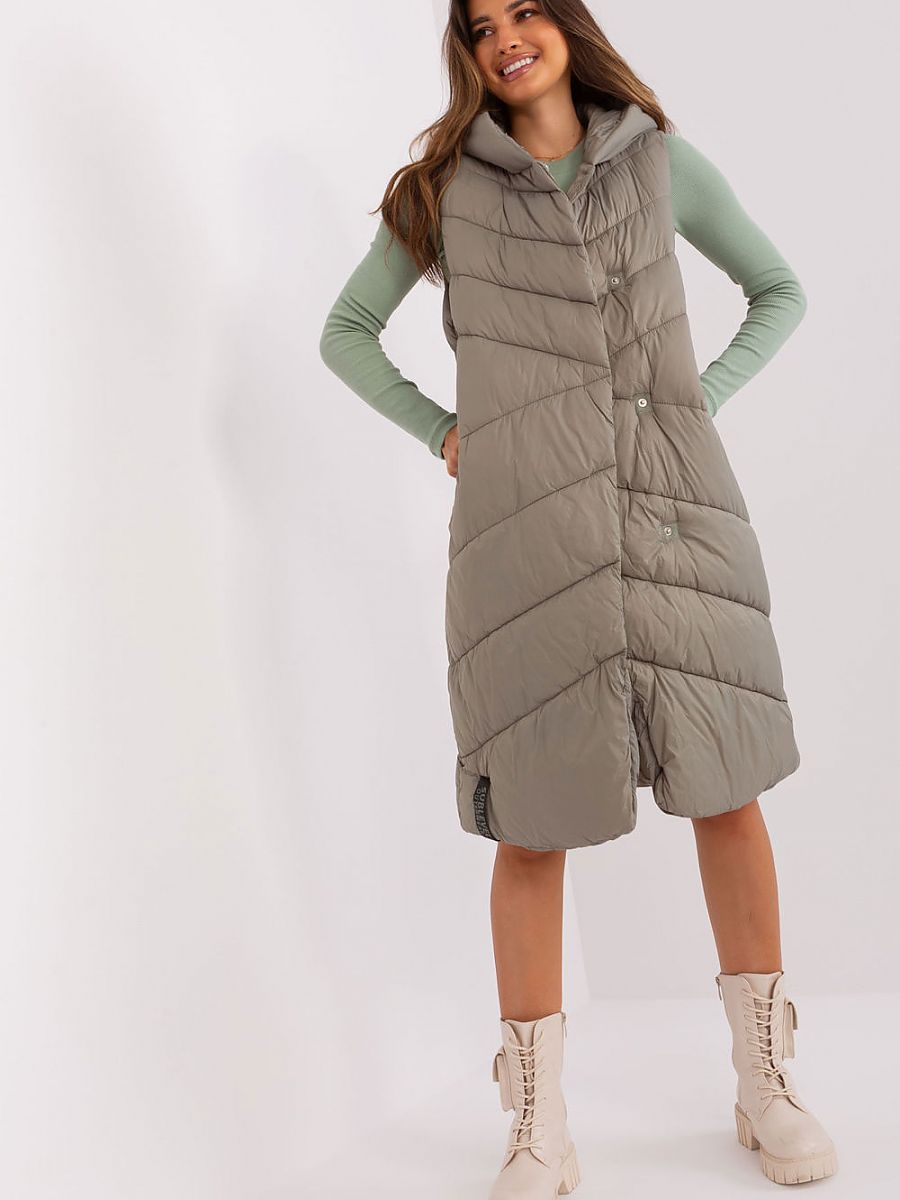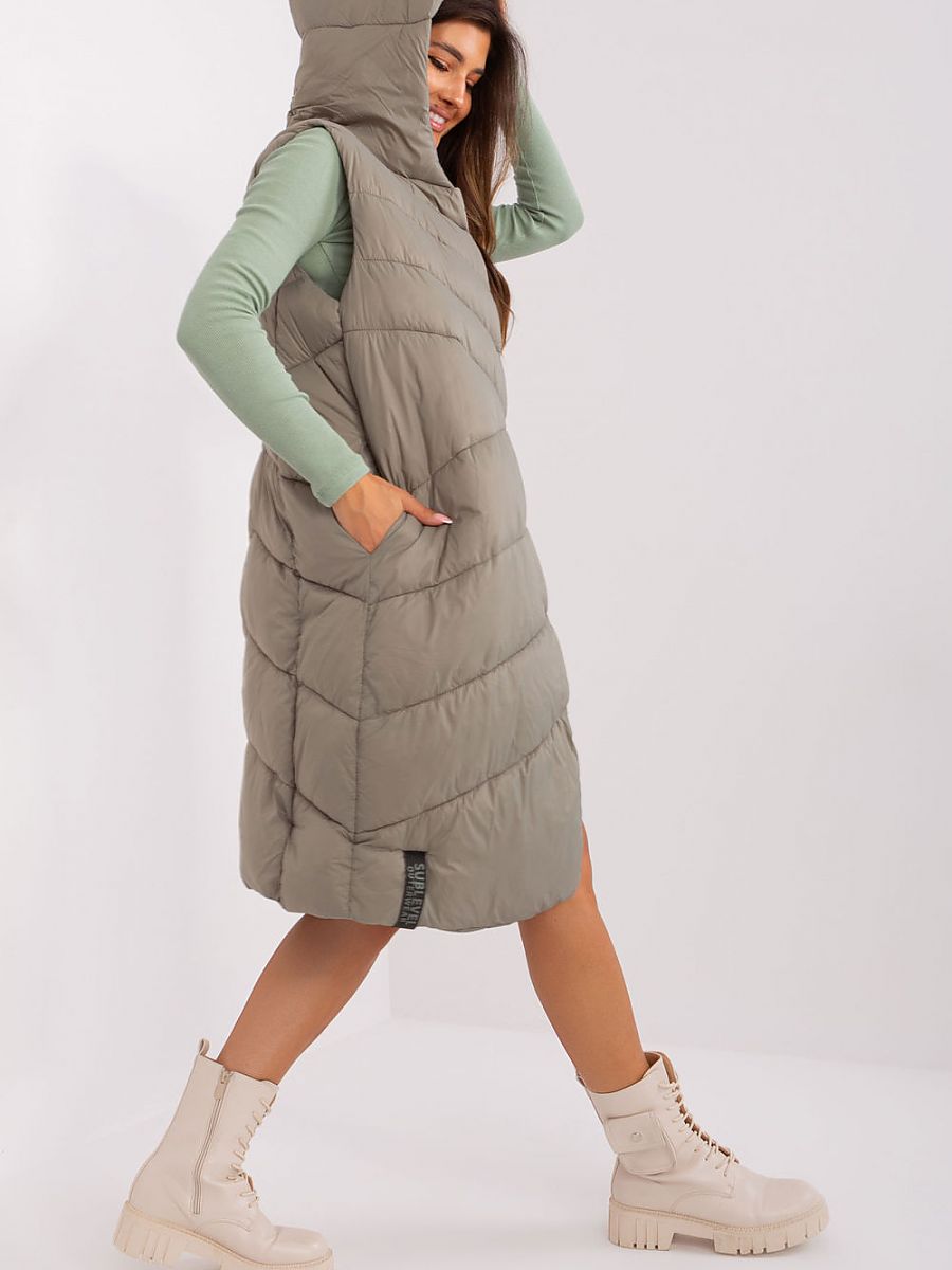 Pikowana, ocieplana kamizelka zapinana na zatrzaski. Kamizelka z kapturem, w całości na podszewce. Po bokach kieszenie wsuwane.