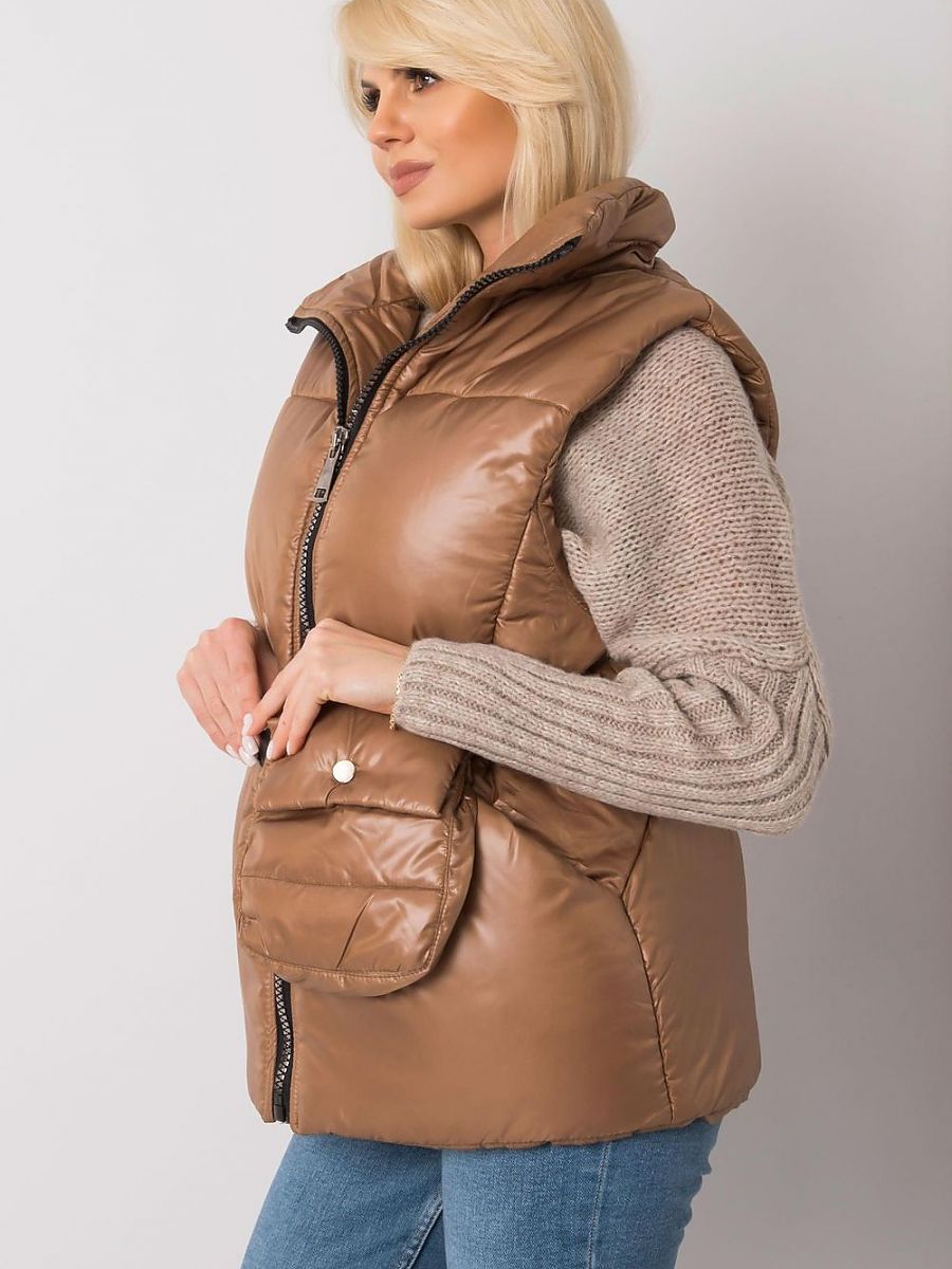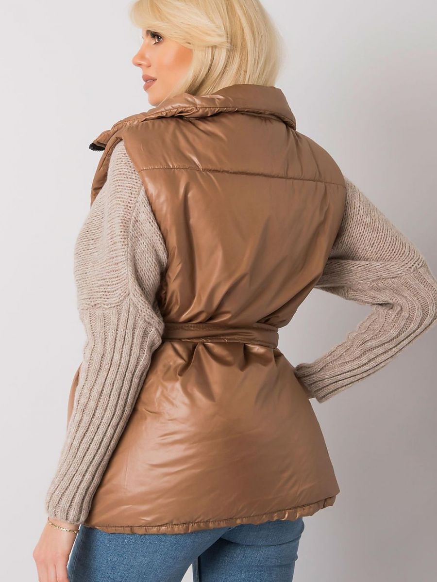 Brązowa puchowa kamizelka na podszewce, zapinana na zamek. Kamizelka z kieszeniami, do kompletu pasek.