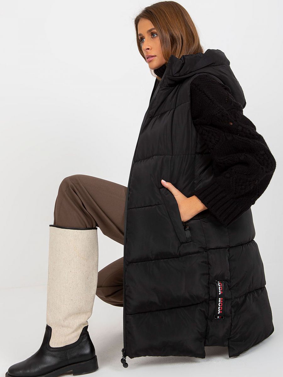 Puchowa pikowana kamizelka z kapturem, zapinana na zamek. Po bokach kieszenie wsuwane. Kamizelka w całości na podszewce.