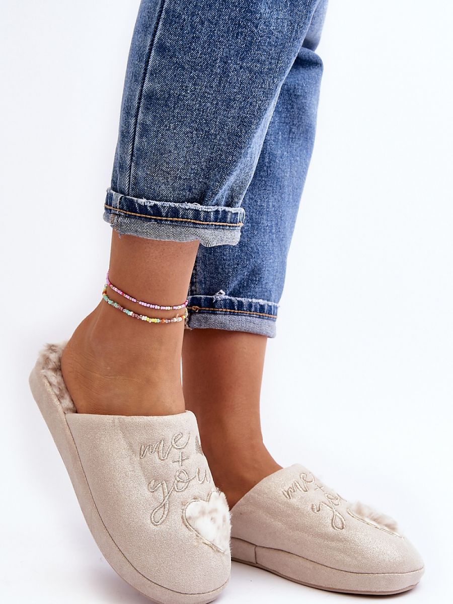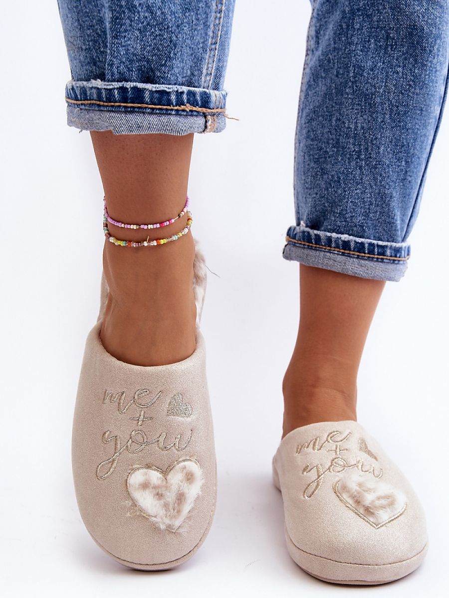 Błyszczące kapcie damskie ozdobione napisem i sercem. Model wsuwany z zakrytym noskiem. Osadzone na grubej podeszwie. Wkładka ocieplona futerkiem.