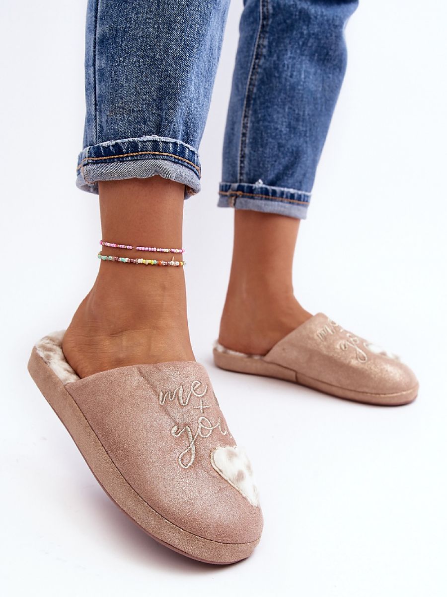 Błyszczące kapcie damskie ozdobione napisem i sercem. Model wsuwany z zakrytym noskiem. Osadzone na grubej podeszwie. Wkładka ocieplona futerkiem.