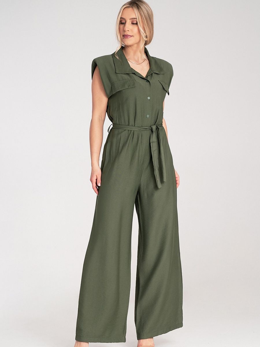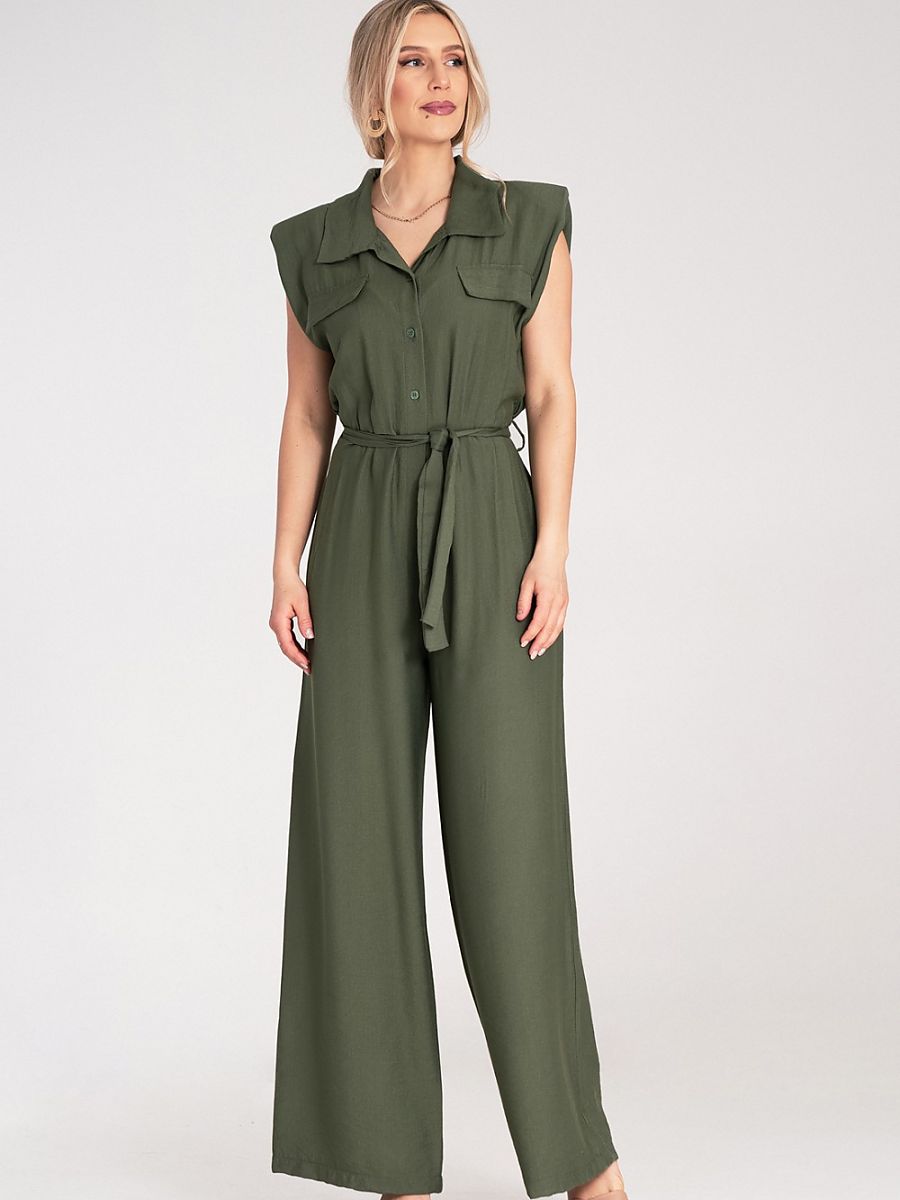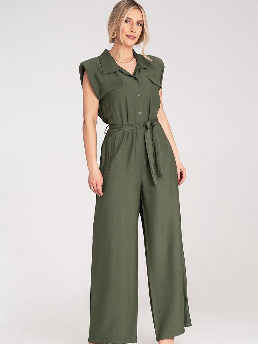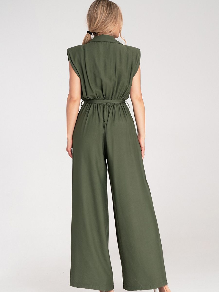 Kombinezon z szerokimi nogawkami, wykonany z lekkiego i przewiewnego materiału. Góra zapinana na guziki, z kołnierzykiem i ozdobnymi patkami na piersiach. Model bez rękawów, z lekko poszerzonymi i wypełnionymi poduszeczką ramionami oraz wiązanym paskiem w talii.