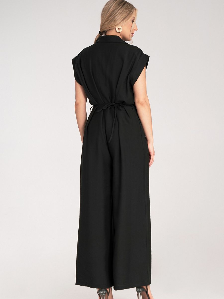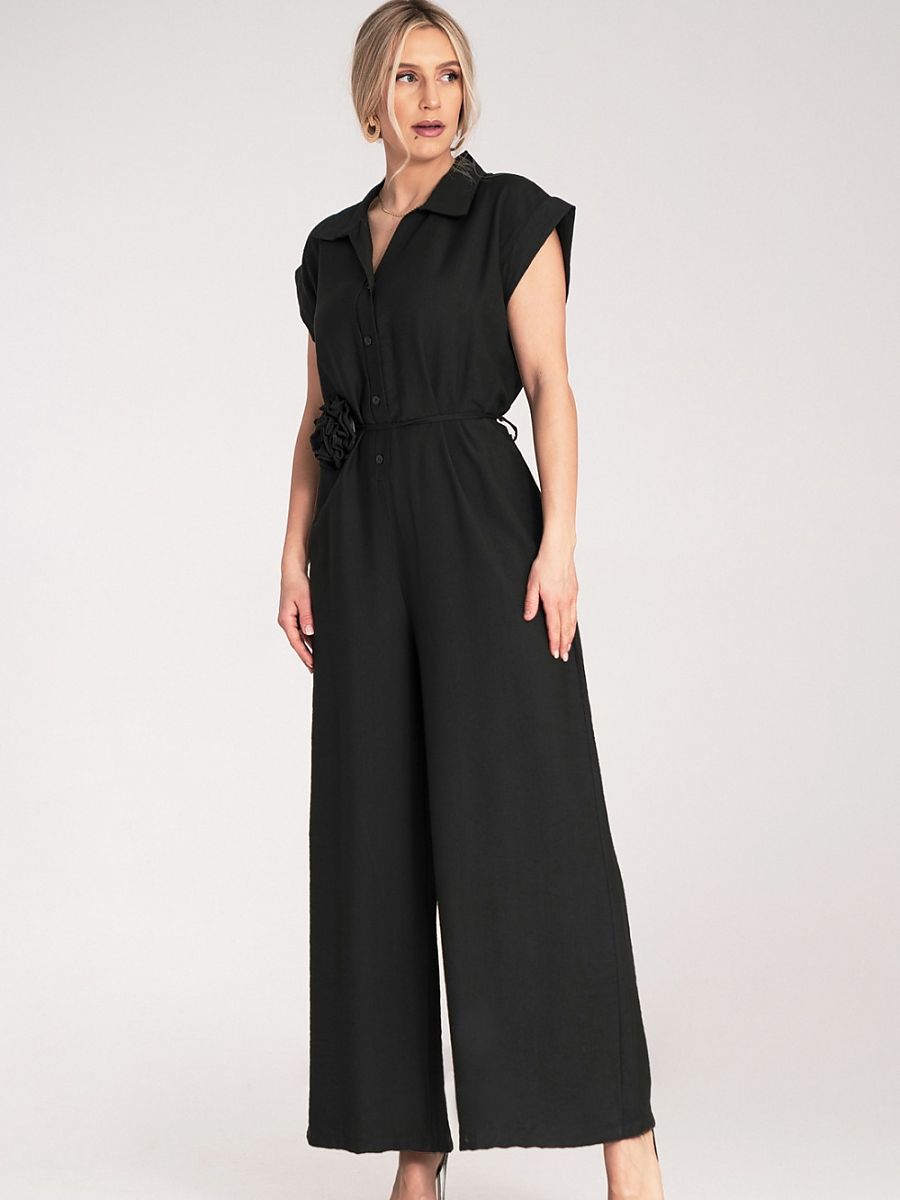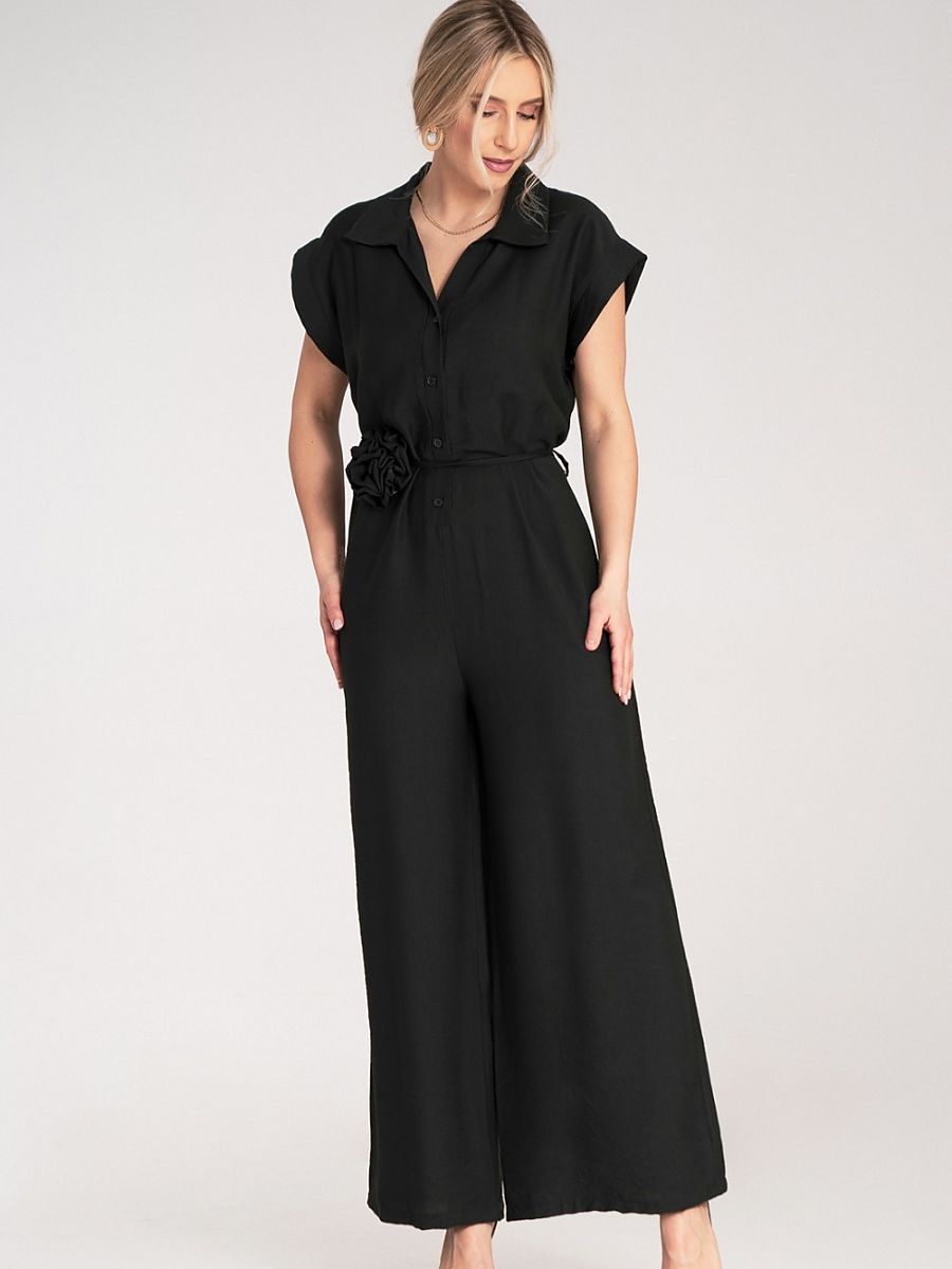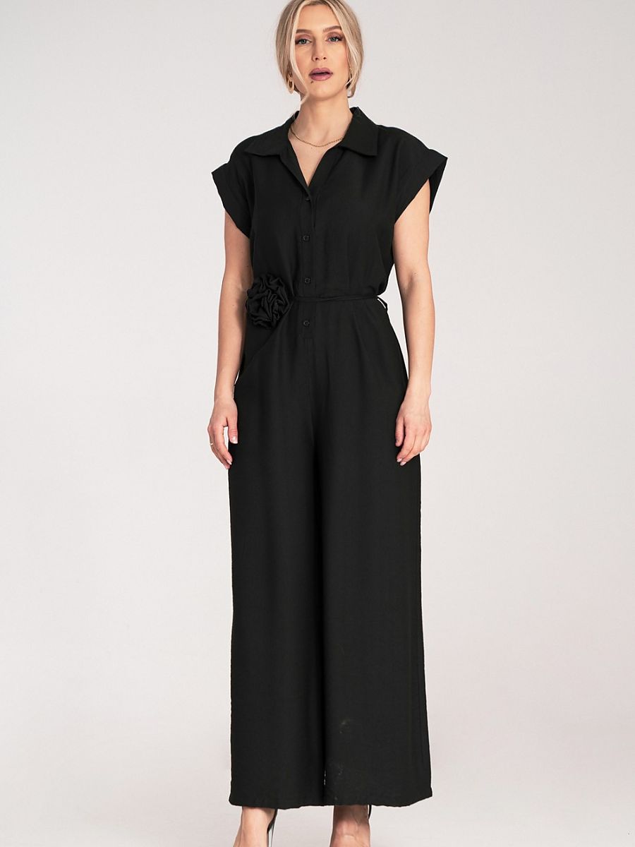 Kombinezon z szerokimi, długimi nogawkami i zapięciem na guziki z przodu. Góra z kołnierzykiem i krótkimi rękawami z podwinięciem. W talii cienki pasek z ozdobną kwiatową aplikacją. Luźny krój i lekki materiał zapewniają swobodę ruchu.