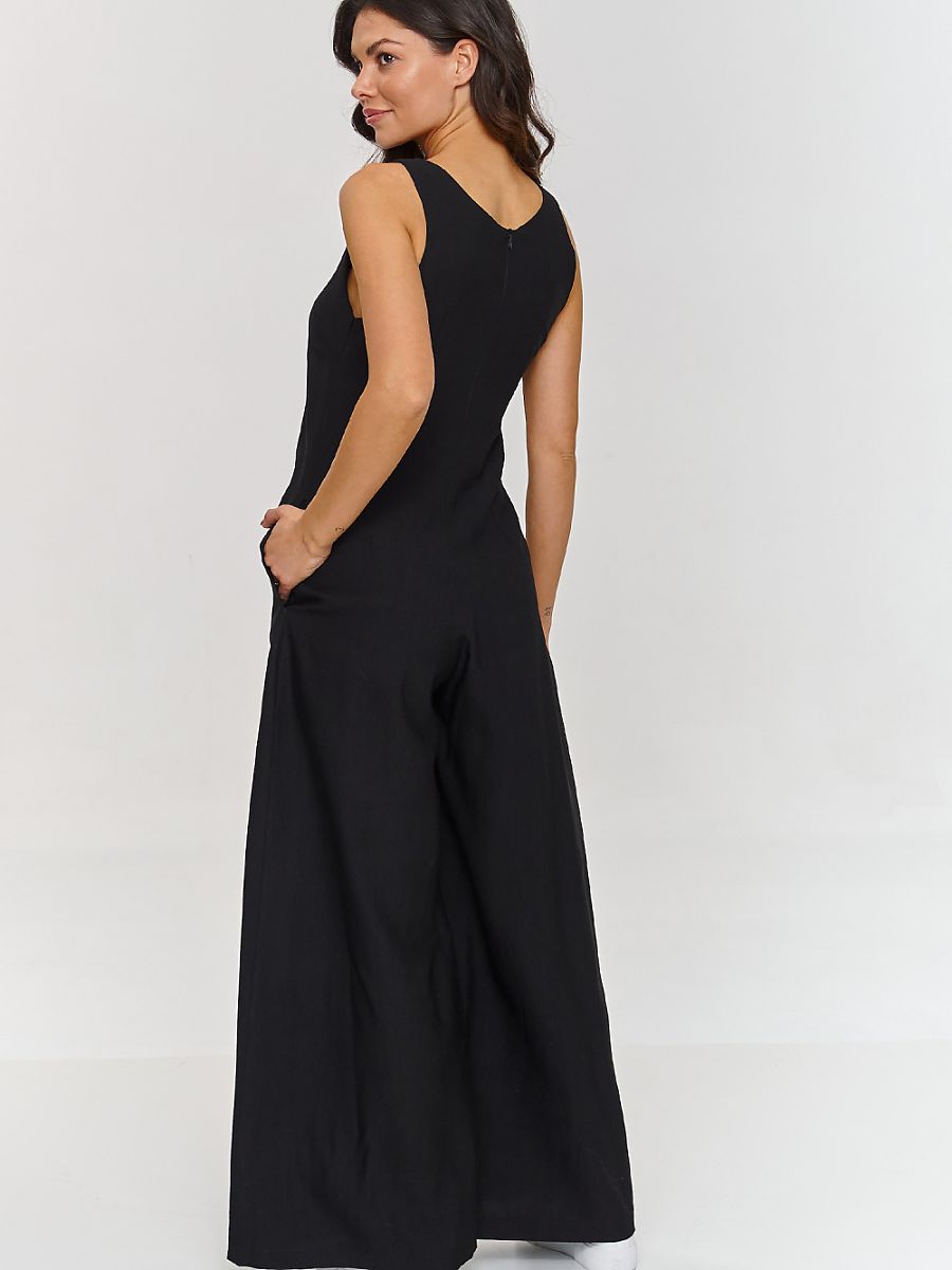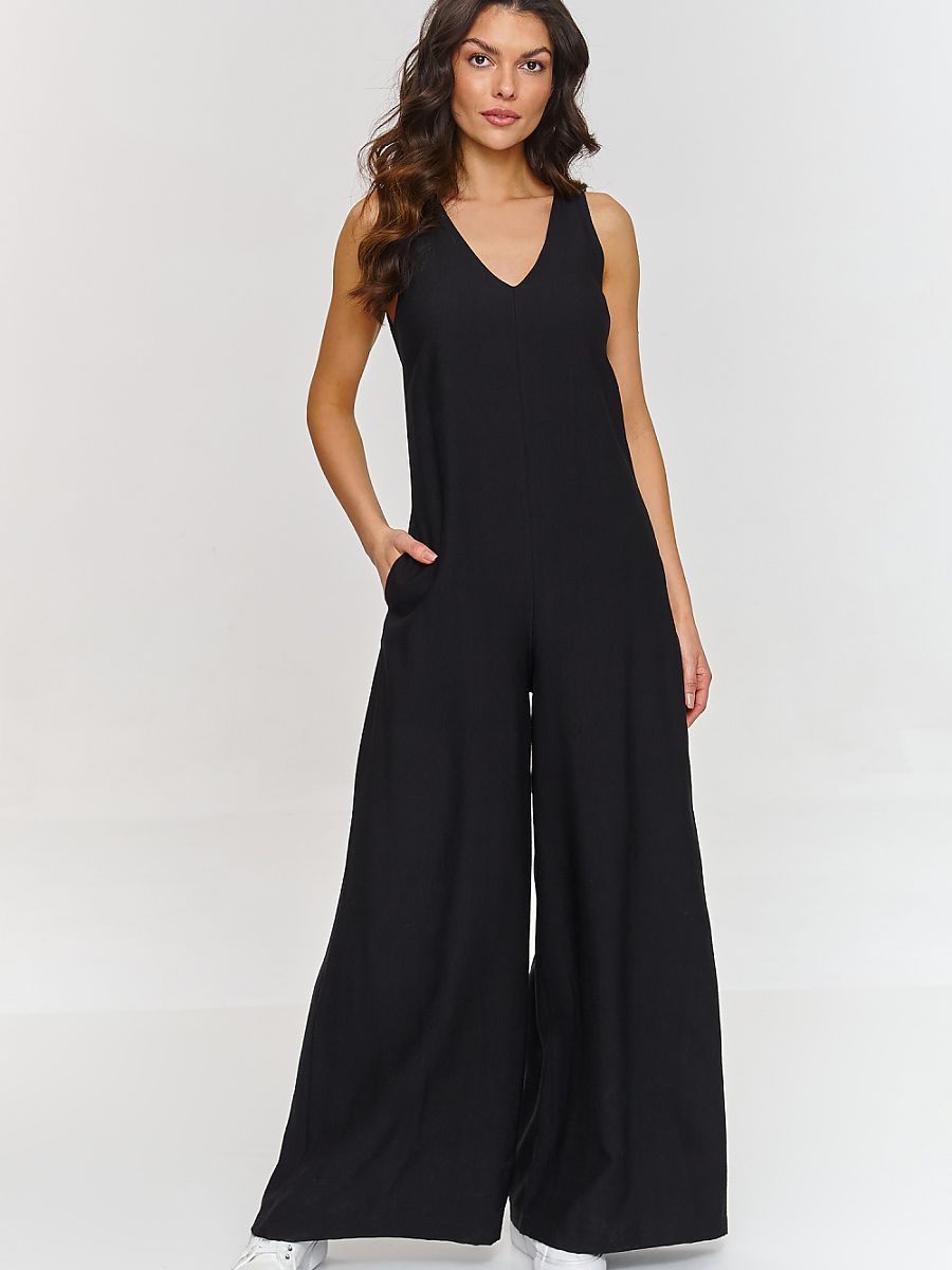Stylowy kombinezon to świetna propozycja dla kobiet szukających modowego outfitu. Model ma subtelny dekolt w kształcie litery V, który nadaje mu eleganckiego i kobiecego wyglądu oraz dodatkowo podkreśla sylwetkę i optycznie wydłuża szyję, dodając klasy i lekkości. Szerokie nogawki oraz luźny fason sprawiają, że kombinezon jest bardzo wygodny i jednocześnie oryginalny. Model jest zapinany na zamek co ułatwia jego zakładanie, natomiast boczne kieszenie stanowią praktyczny dodatek. Dodatkowym jego atutem jest przyjemny w dotyku i przewiewny materiał co czyni go doskonałą propozycją na ciepłe dni. Dzięki prostemu, ale efektownemu fasonowi, kombinezon nadaje się zarówno na codzienne wyjścia, jak i na bardziej formalne okazje, takie jak spotkania czy wieczorne wyjścia. Można go połączyć z białymi sneakersami na co dzień lub z szpilkami na bardziej eleganckie wydarzenia.