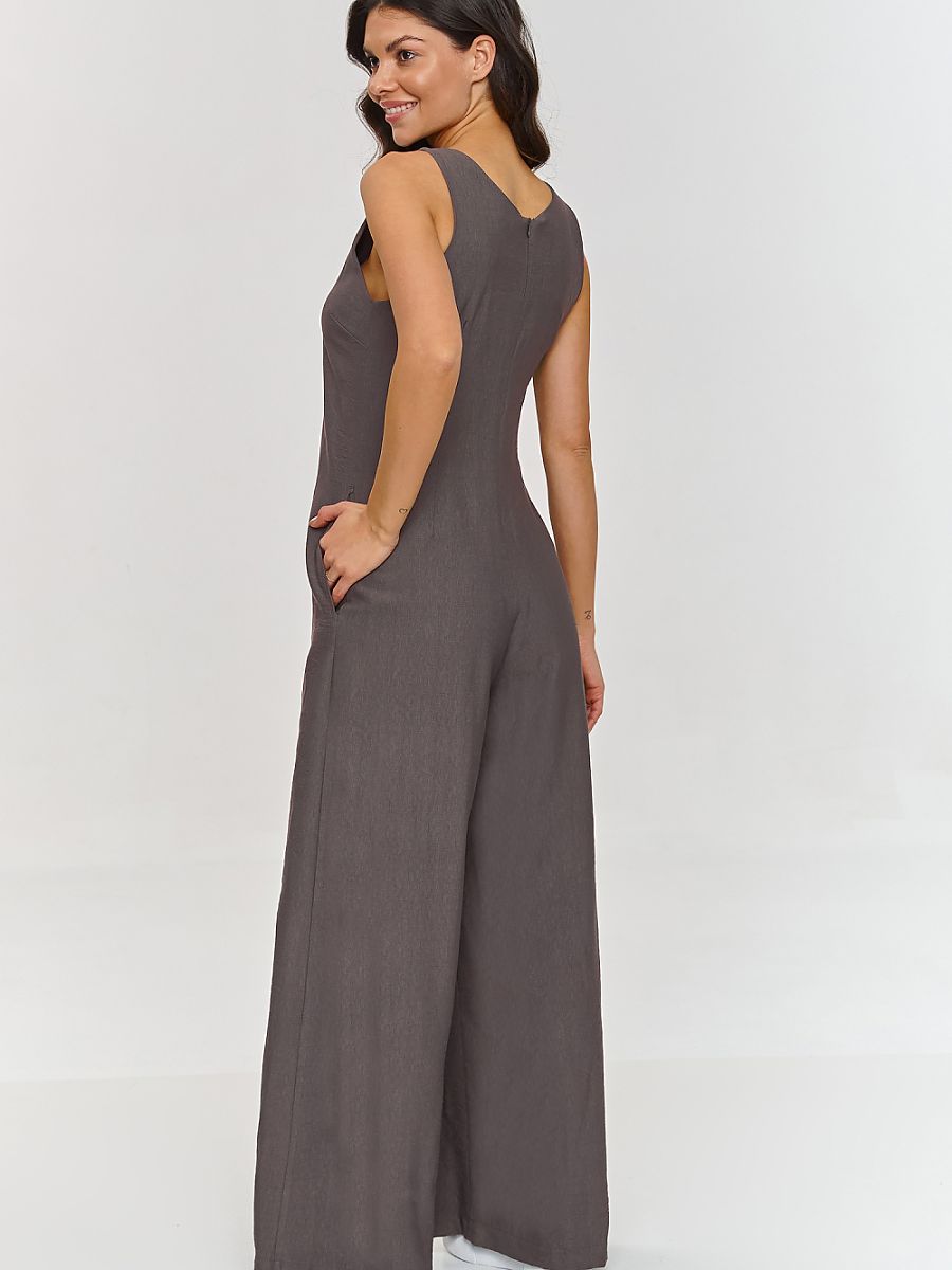 Stylowy kombinezon to świetna propozycja dla kobiet szukających modowego outfitu. Model ma subtelny dekolt w kształcie litery V, który nadaje mu eleganckiego i kobiecego wyglądu oraz dodatkowo podkreśla sylwetkę i optycznie wydłuża szyję, dodając klasy i lekkości. Szerokie nogawki oraz luźny fason sprawiają, że kombinezon jest bardzo wygodny i jednocześnie oryginalny. Model jest zapinany na zamek co ułatwia jego zakładanie, natomiast boczne kieszenie stanowią praktyczny dodatek. Dodatkowym jego atutem jest przyjemny w dotyku i przewiewny materiał co czyni go doskonałą propozycją na ciepłe dni. Dzięki prostemu, ale efektownemu fasonowi, kombinezon nadaje się zarówno na codzienne wyjścia, jak i na bardziej formalne okazje, takie jak spotkania czy wieczorne wyjścia. Można go połączyć z białymi sneakersami na co dzień lub z szpilkami na bardziej eleganckie wydarzenia.
