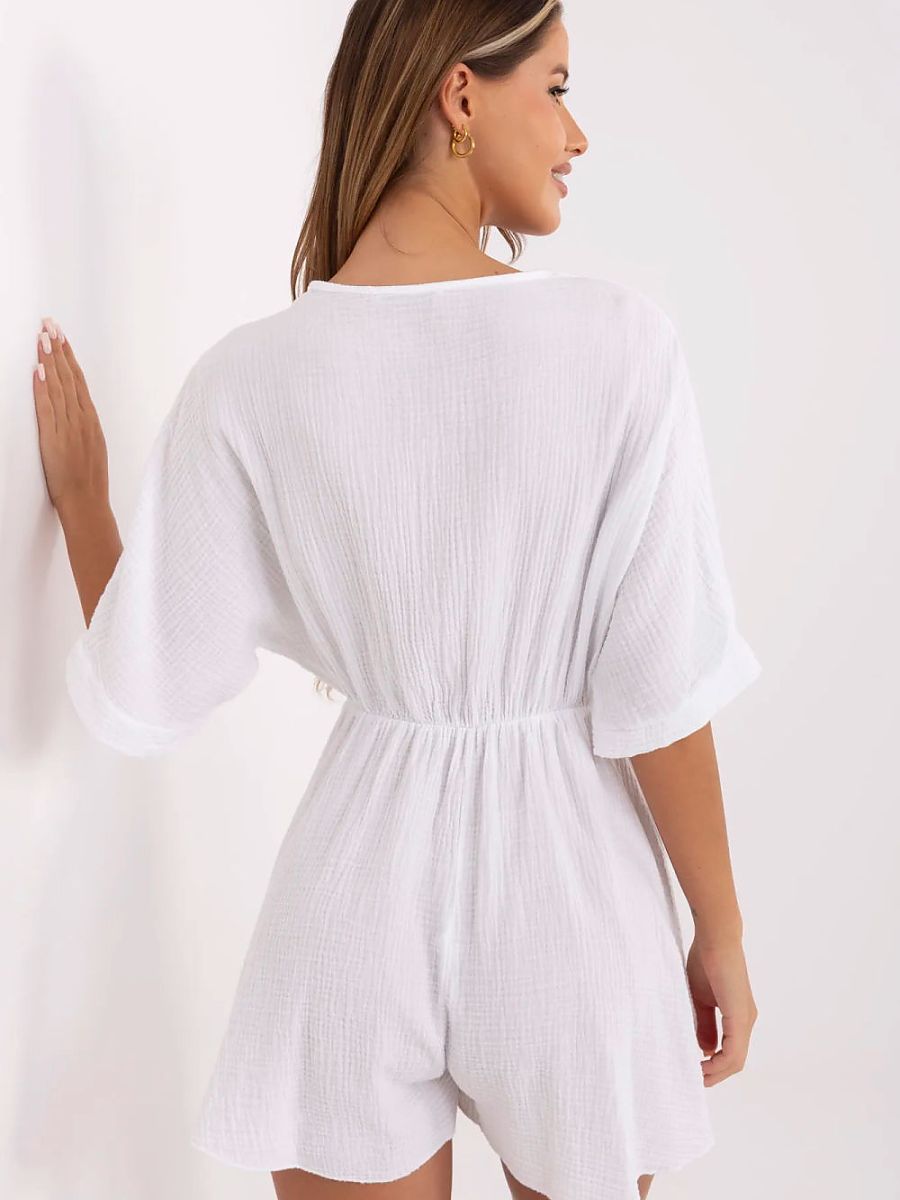 Lekki i przewiewny kombinezon muślinowy to idealna propozycja na codzienne, letnie stylizacje. Wykonany z naturalnej, oddychającej bawełny, gwarantuje komfort noszenia przez cały dzień nawet w upalne dni. Model o krótkiej długości, z krótkim rękawem i kopertowym dekoltem, który subtelnie podkreśla linię szyi i dekoltu. W talii wszyta guma, dzięki której kombinezon dopasowuje się do sylwetki i podkreśla jej proporcje. Brak zapięcia sprawia, że zakładanie jest szybkie i wygodne. Gładka faktura tkaniny i prosty fason czynią go uniwersalnym elementem garderoby, doskonale sprawdzi się zarówno na spacer, zakupy, jak i letnie spotkanie z przyjaciółmi.