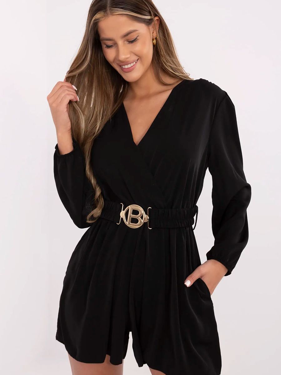 Krótki kombinezon damski to połączenie elegancji i wygody, idealny na wiele okazji: od codziennych wyjść, przez spotkania biznesowe, aż po wieczorne imprezy. Wykonany z przyjemnej w dotyku tkaniny (poliester, wiskoza, elastan), świetnie się układa i zapewnia swobodę ruchów. Kopertowy dekolt dodaje kobiecego uroku, a długi rękaw sprawia, że model sprawdzi się również w chłodniejsze dni. Gładki materiał i zapinany pasek w talii pięknie podkreślają sylwetkę. Stylowy, a zarazem praktyczny wybór na wiele okazji.