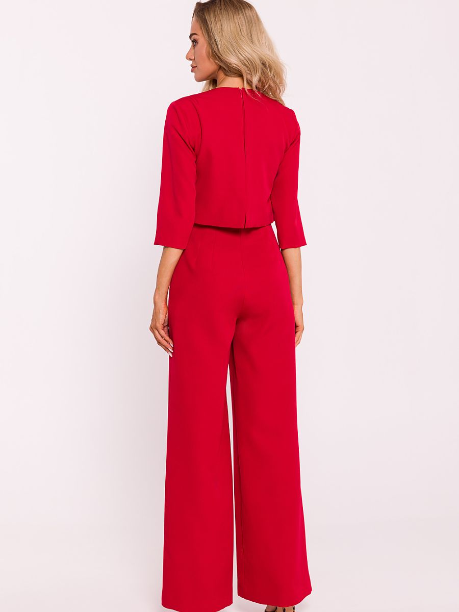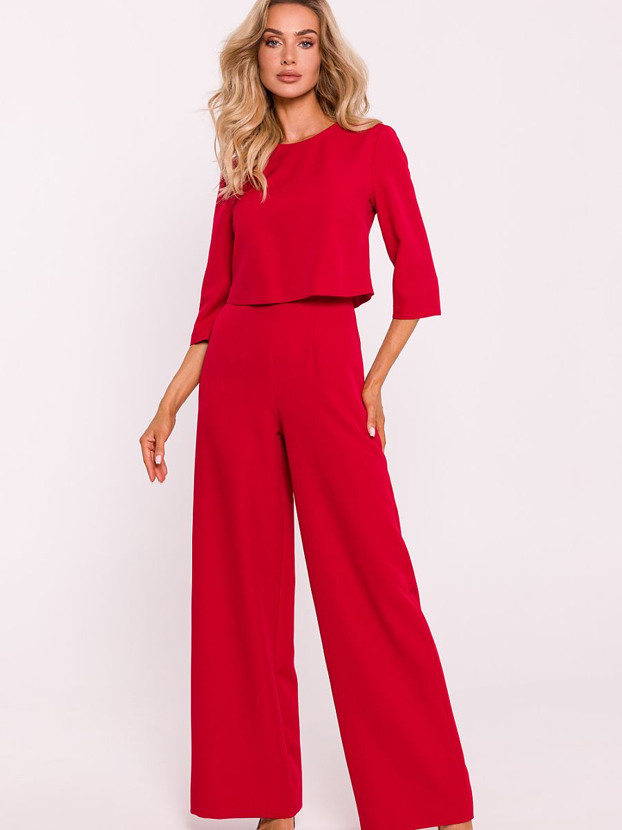 Elegancki kombinezon damski wykonany z wysokiej jakości tkaniny. Charakteryzuje się szerokimi nogawkami, które nadają mu modny, swobodny wygląd. Góra kombinezonu jest podwójna, co dodaje mu struktury i elegancji, a krótkie rękawy zapewniają komfort w cieplejsze dni. Z tyłu znajduje się kryty zamek, który ułatwia zakładanie i zdejmowanie. Boczne kieszenie wsuwane dodają praktyczności i funkcjonalności. Zaprojektowany i uszyty w Polsce, łączy nowoczesny styl z doskonałym rzemiosłem.