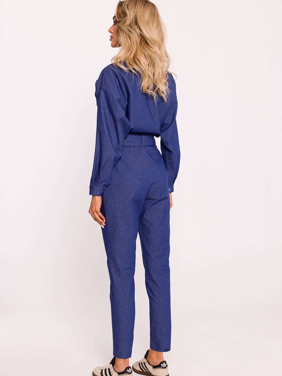 Elegancki kombinezon damski wykonany z tkaniny bawełnianej, idealny na co dzień i na specjalne okazje. Góra na zakładkę z kołnierzem dodaje szyku, a zapinanie na rozporek, napę oraz kryty guzik zapewnia wygodę i bezpieczeństwo noszenia. Długie rękawy zapinane na zatrzask oraz zwężane nogawki podkreślają sylwetkę. Boczne kieszenie dodają praktyczności, a pasek zapinany na zatrzaski z możliwością regulacji pozwala na idealne dopasowanie do talii. Zaprojektowany i uszyty w Polsce, ten kombinezon łączy w sobie styl, komfort i funkcjonalność.