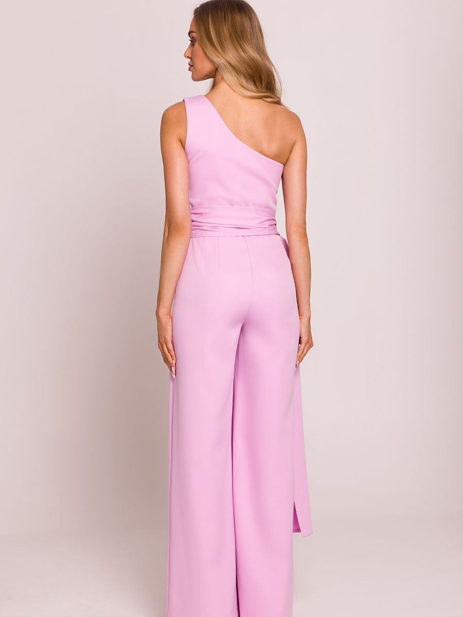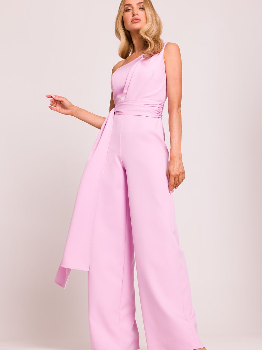 Elegancki, asymetryczny kombinezon z motywem na jedno ramię, który przyciąga wzrok swoją wyjątkową formą. Długie szarfy wszyte do boków nadają mu lekkości i efektownego charakteru, pozwalając na ciekawe stylizowanie. Lekko poszerzone nogawki zapewniają komfort i elegancki wygląd. Model zapinany na kryty zamek z boku, co gwarantuje idealne dopasowanie. Całość zaprojektowana i uszyta w Polsce z najwyższą dbałością o detale, łącząc nowoczesność z klasyką.