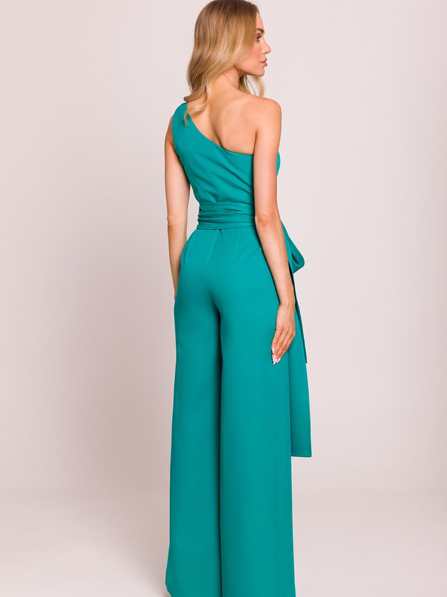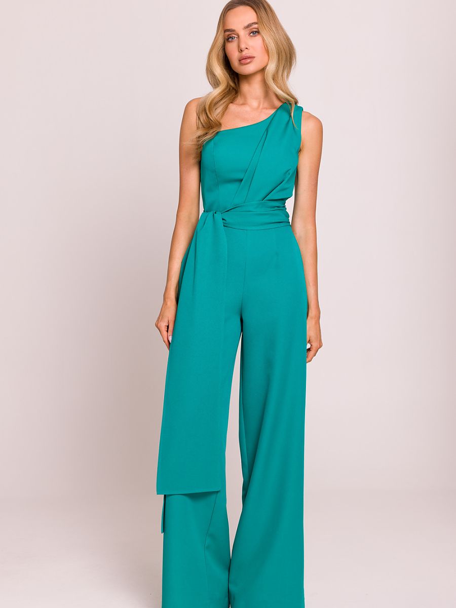 Elegancki, asymetryczny kombinezon z motywem na jedno ramię, który przyciąga wzrok swoją wyjątkową formą. Długie szarfy wszyte do boków nadają mu lekkości i efektownego charakteru, pozwalając na ciekawe stylizowanie. Lekko poszerzone nogawki zapewniają komfort i elegancki wygląd. Model zapinany na kryty zamek z boku, co gwarantuje idealne dopasowanie. Całość zaprojektowana i uszyta w Polsce z najwyższą dbałością o detale, łącząc nowoczesność z klasyką.
