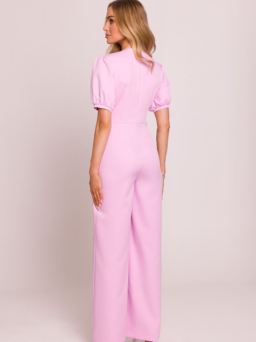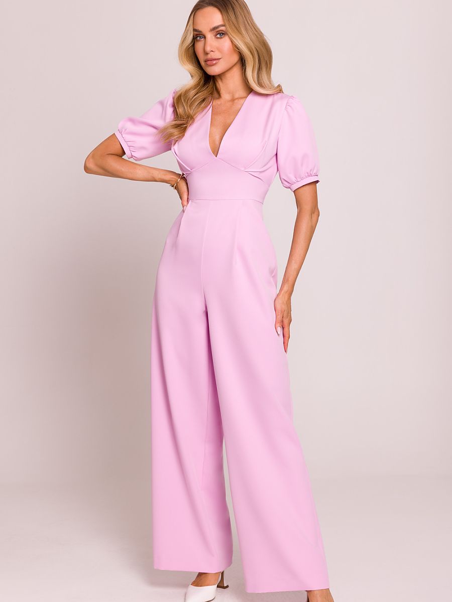 Stylowy kombinezon o kobiecym kroju, wykonany z wysokiej jakości tkaniny. Głęboki dekolt w kształcie litery V pięknie eksponuje szyję i dekolt, a podkreślona talia podkreśla sylwetkę. Krótkie bufiaste rękawy zakończone mankietami dodają romantycznego akcentu, a lekko poszerzone nogawki z zakładkami od talii zapewniają elegancki i swobodny look. Model zapinany na kryty zamek z tyłu, z górą na podszewce dla większego komfortu noszenia. Całość zaprojektowana i uszyta w Polsce z dbałością o każdy detal.