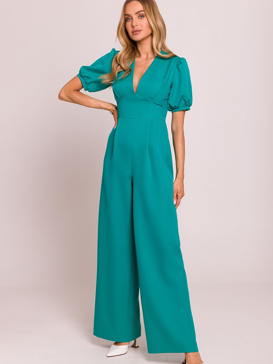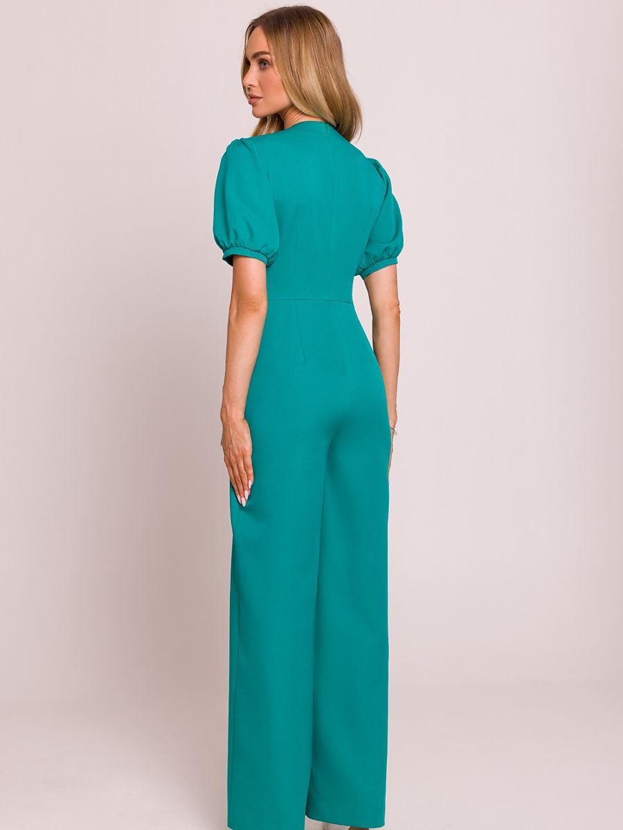 Stylowy kombinezon o kobiecym kroju, wykonany z wysokiej jakości tkaniny. Głęboki dekolt w kształcie litery V pięknie eksponuje szyję i dekolt, a podkreślona talia podkreśla sylwetkę. Krótkie bufiaste rękawy zakończone mankietami dodają romantycznego akcentu, a lekko poszerzone nogawki z zakładkami od talii zapewniają elegancki i swobodny look. Model zapinany na kryty zamek z tyłu, z górą na podszewce dla większego komfortu noszenia. Całość zaprojektowana i uszyta w Polsce z dbałością o każdy detal.