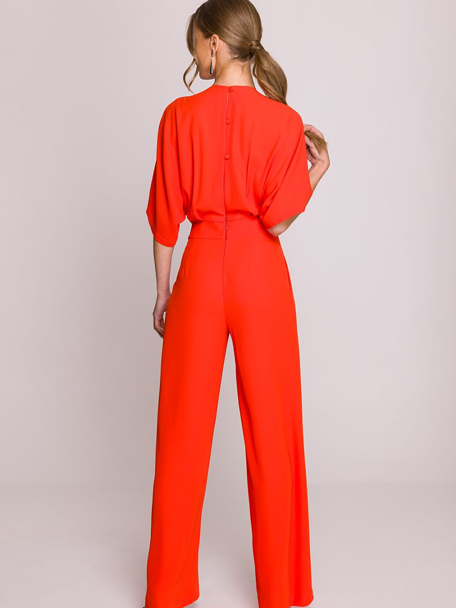 Stylowy i elegancki kombinezon damski, który łączy wygodę z kobiecym fasonem. Góra w stylu kopertowym z subtelnymi zakładkami pięknie układa się na sylwetce, a dekolt V dodaje lekkości i podkreśla linię szyi. Krótkie rękawy zapewniają komfort i swobodę ruchu. Lekko poszerzone nogawki nadają całości harmonijnych proporcji, a boczne kieszenie dodają praktycznego charakteru. Model zapinany na kryty zamek z tyłu, dzięki czemu prezentuje się estetycznie i elegancko. Kombinezon zaprojektowany i uszyty w Polsce, z dbałością o detale. Idealny wybór na co dzień, do pracy lub na wyjątkowe okazje.