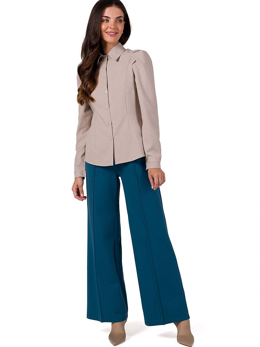 Ta koszula to wyjątkowy produkt, zaprojektowany i wyprodukowany w Polsce, co gwarantuje wysoką jakość wykonania. Jej tkanina jest trwała i komfortowa, idealna na wiele okazji. Koszula jest wyposażona w guziki oraz kołnierzyk, co pozwala na regulację jej wyglądu w zależności od okoliczności. Długi rękaw jest ozdobiony efektownymi marszczeniami na ramionach, dodając koszuli elegancji. Mankiety rękawów można zapinać na jeden guzik, co umożliwia regulację ich długości. Dolna część koszuli zakończona jest na półokrągło, co nadaje jej swobodny, luźniejszy fason. To uniwersalna koszula, która doskonale sprawdzi się zarówno na co dzień, jak i na bardziej formalne okazje, dodając stylu każdej stylizacji.