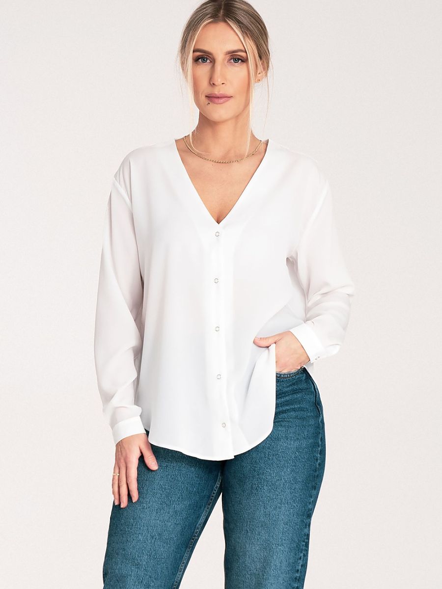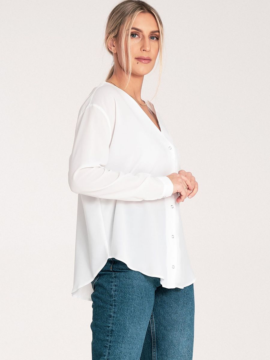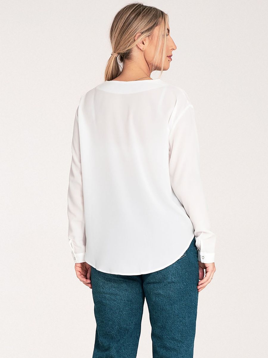 Koszula z długim rękawem i mankietem zapinanym na zatrzaski. Dekolt w serek, bez kołnierzyka. Koszula zapinana z przodu na zatrzaski.