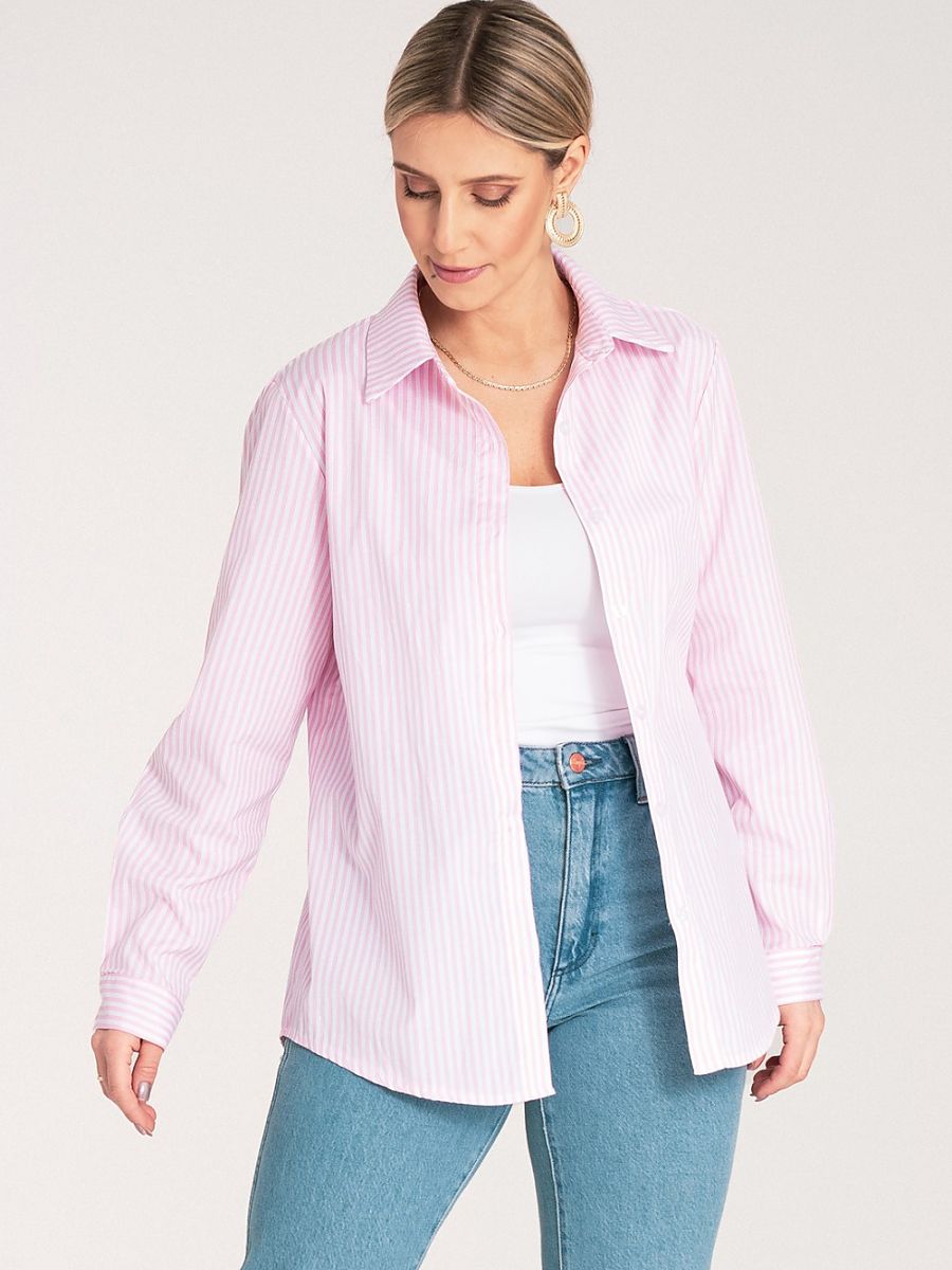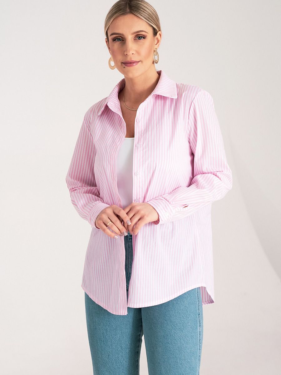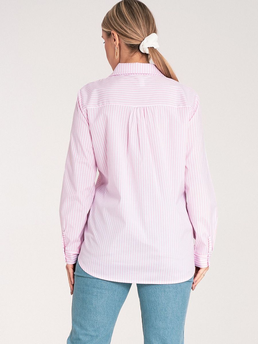 Klasyczna koszula w pionowe paski zapinana na guziki. Model z eleganckim kołnierzykiem i długimi rękawami z mankietami. Wykonana z lekkiego materiału, idealna do biura i na co dzień.