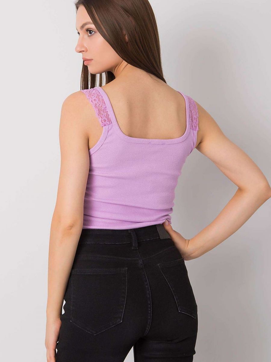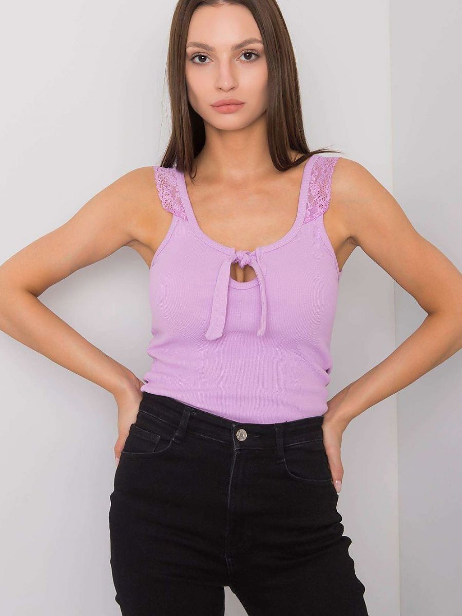 Koszulka na ramiączkach ozdobionych koronką. Dekolt okrągły z ozdobnym wiązaniem. Top wykonany z akrylowego prążkowanego materiału.